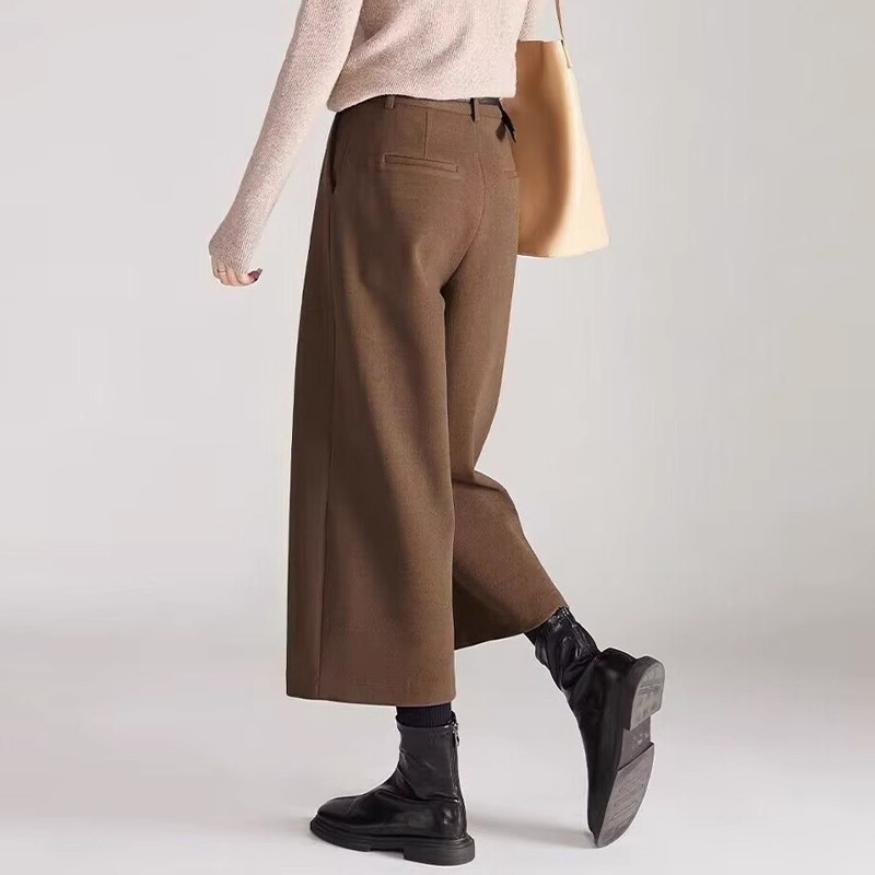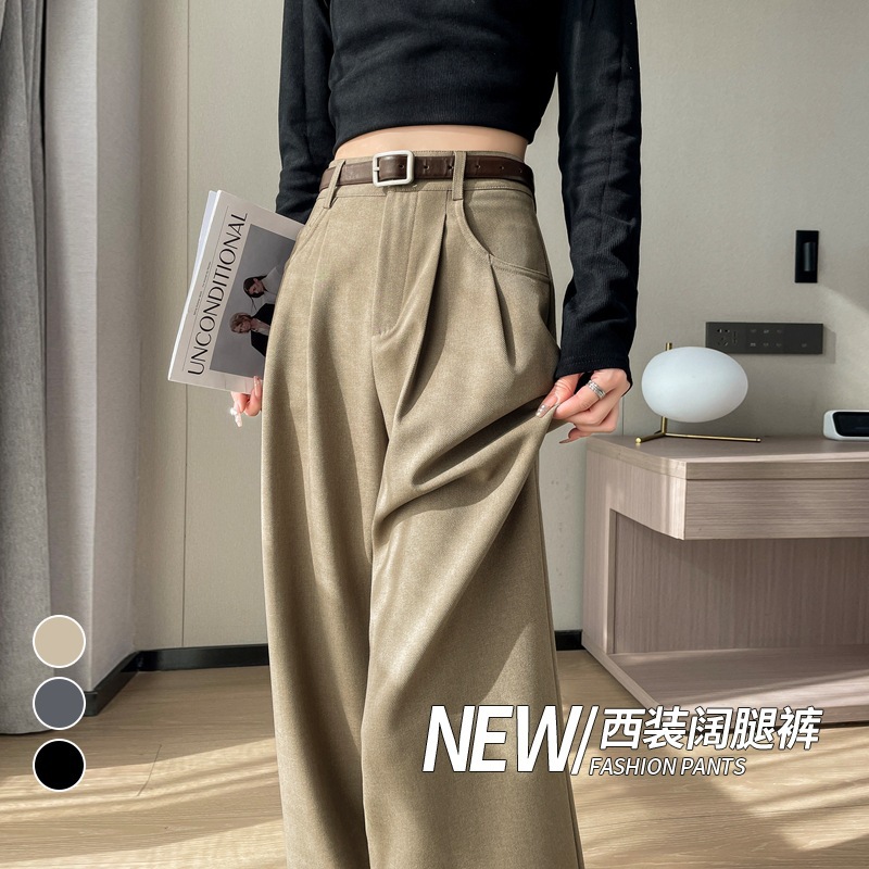 コーヒー色のスーツパンツ レディース 春の新作 ドレープ感のあるハイウエスト 細身ワイドパンツ ストレートカジュアルパンツ マキシ丈パンツ レディース 裏起毛