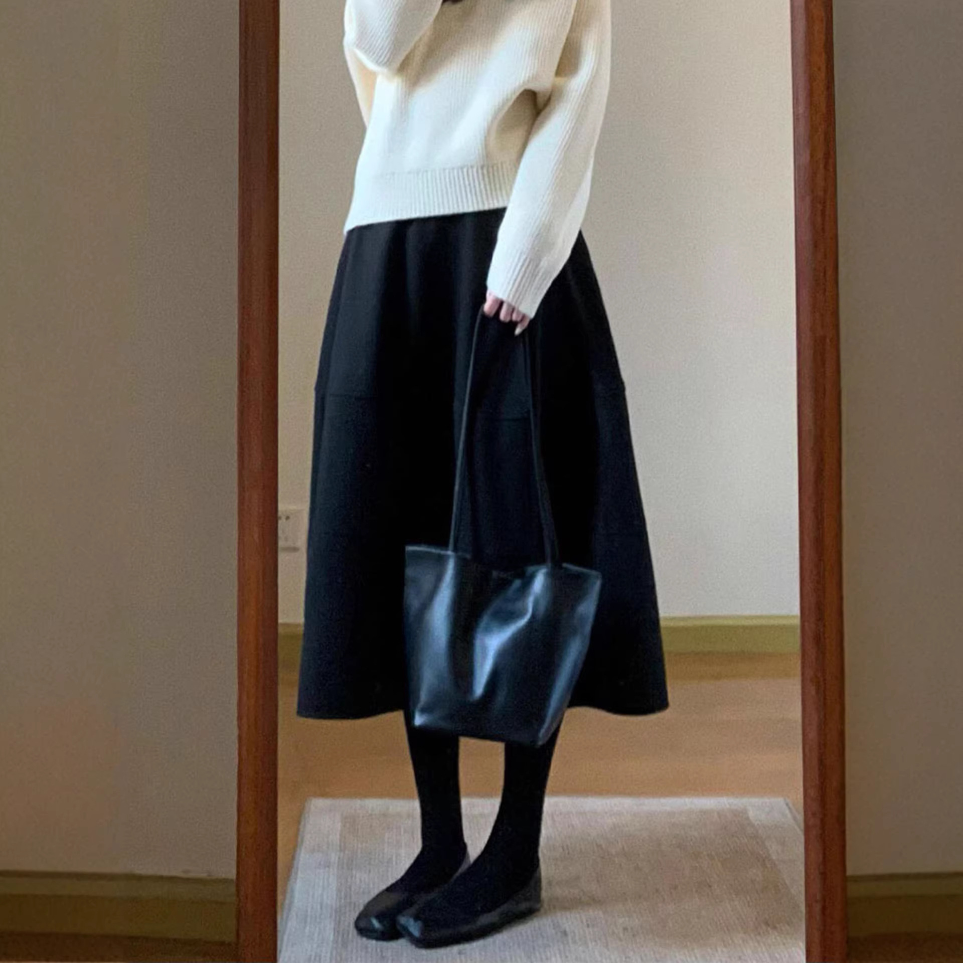 港风复古毛呢拼接半身裙冬季加厚高腰宽松老钱风设计感中长花苞裙