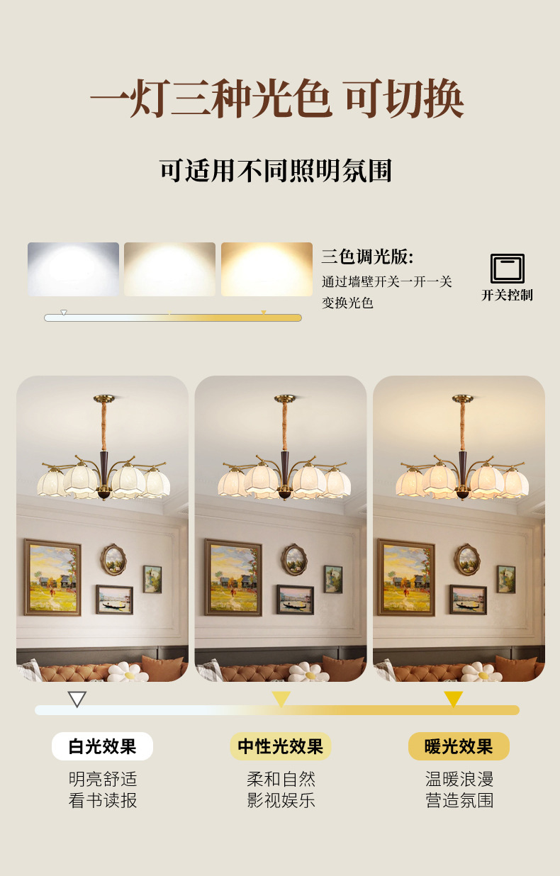 光の色 3ヘッドシャンデリアには3色の電球が付属します,6ヘッドシャンデリアには3色の電球が付属します,8頭シャンデリアには3色の電球が付属します