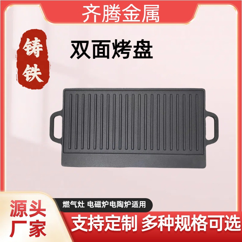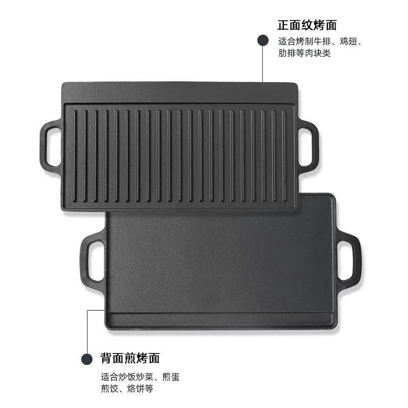 铸铁长方形烤盘无涂层生铁盘条纹铁板烧家用煎盘户外烧烤双面烤板