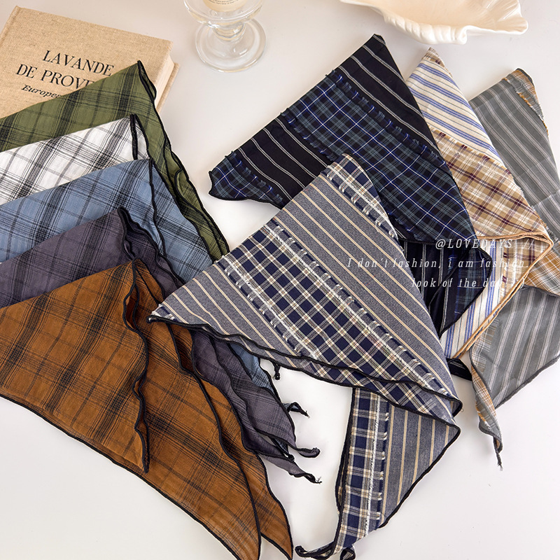 日系复古线条格子三角巾女2025新款时髦百搭装饰包头巾丝巾腰封潮