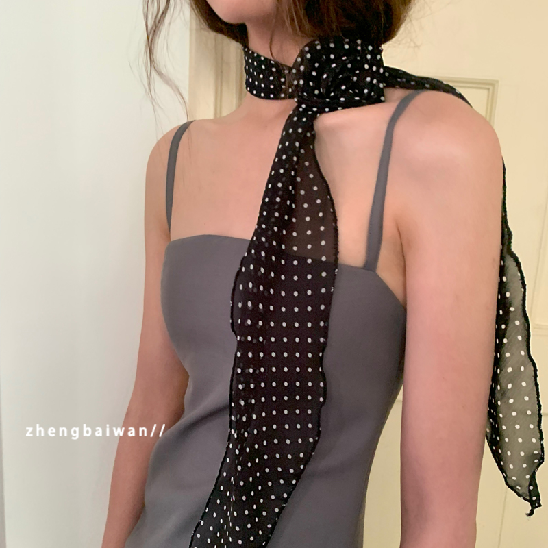 郑佰万长条波点丝巾女春夏新百搭玫瑰花围脖飘带细窄高级感潮长巾
