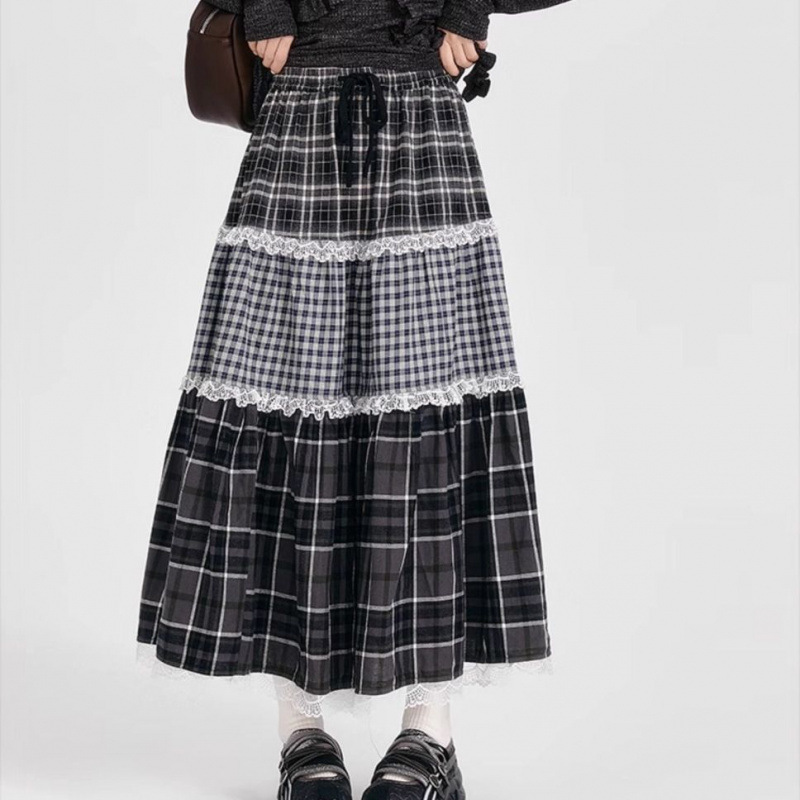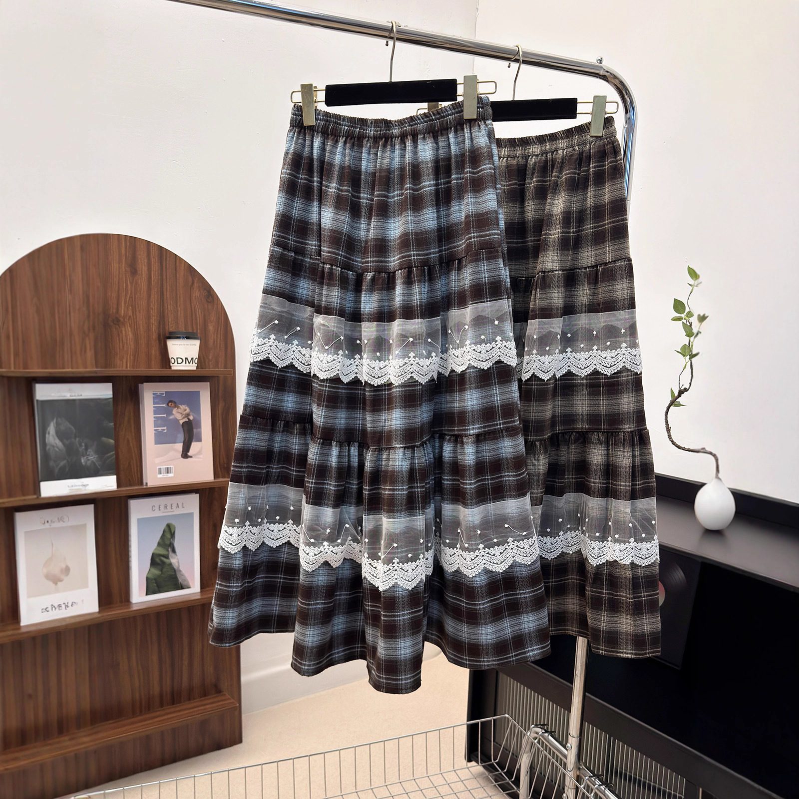 2025美式复古格子蕾丝拼接半身裙女秋冬新款高腰显瘦长款蛋糕裙