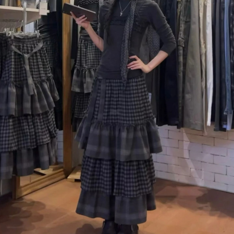 格子縞のレースはケーキの格子の中で長いスカートの女性の秋冬2025の新型の経典の復古の設計の半身のスカートをつなぎます。