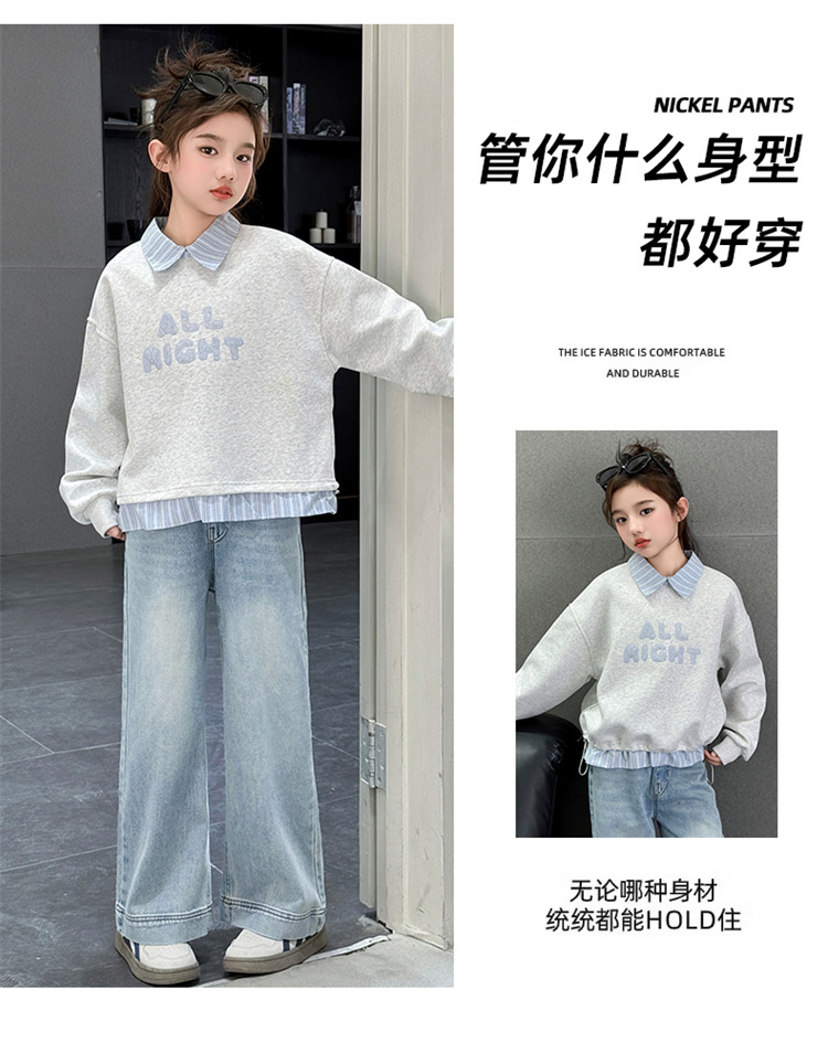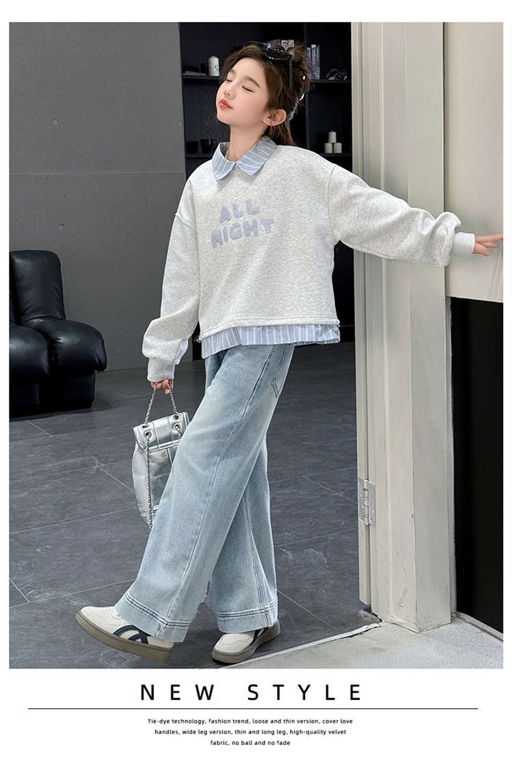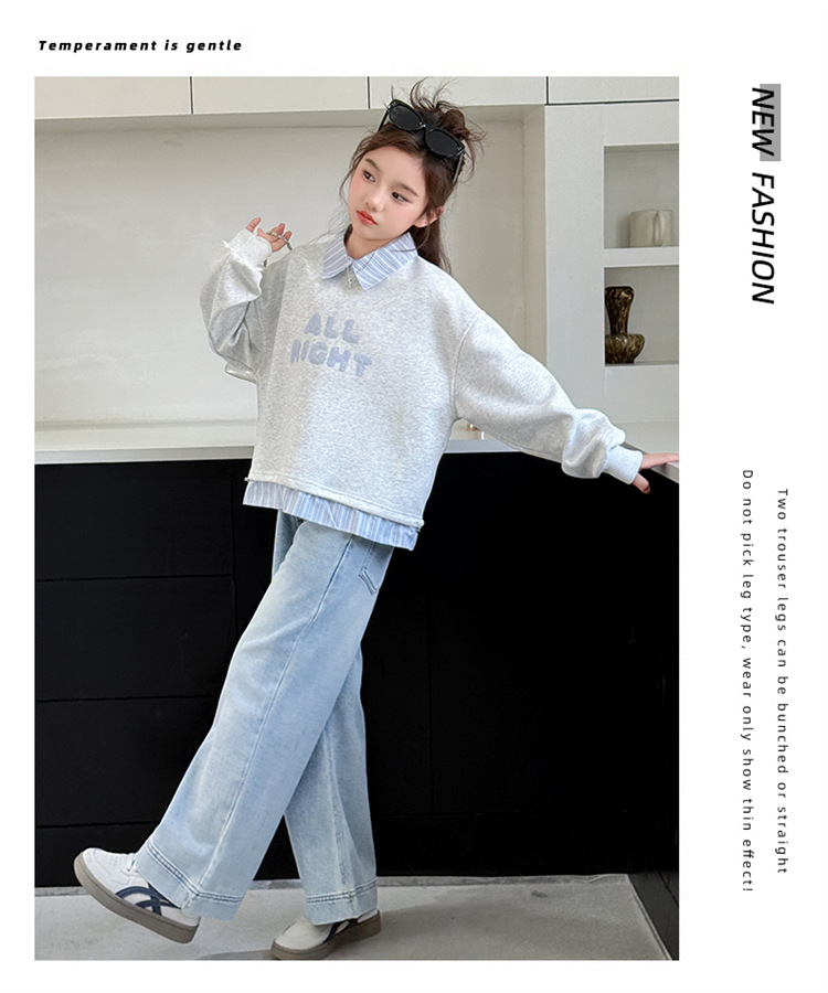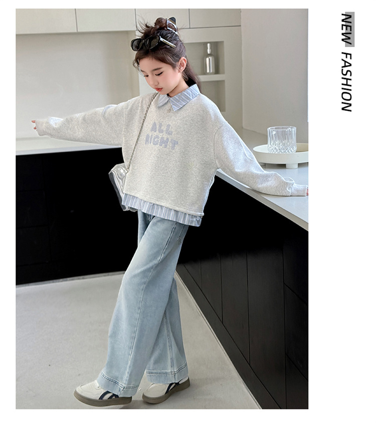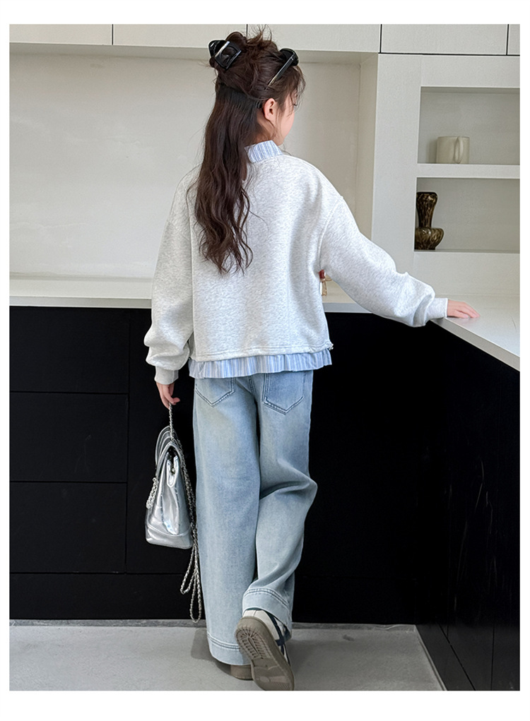 麻グレーのスウェットシャツ,ライトブルーのジーンズ,スウェットシャツ+ジーンズ