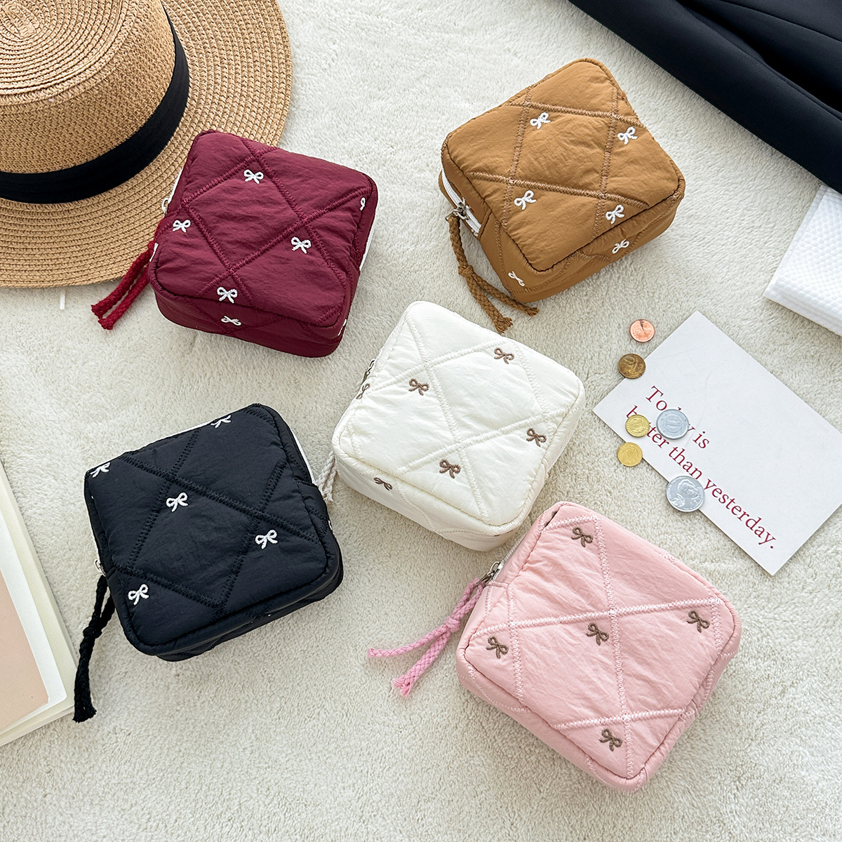 新款绗缝蝴蝶结化妆包旅行便携洗漱包口红包多功能卫生巾收纳包