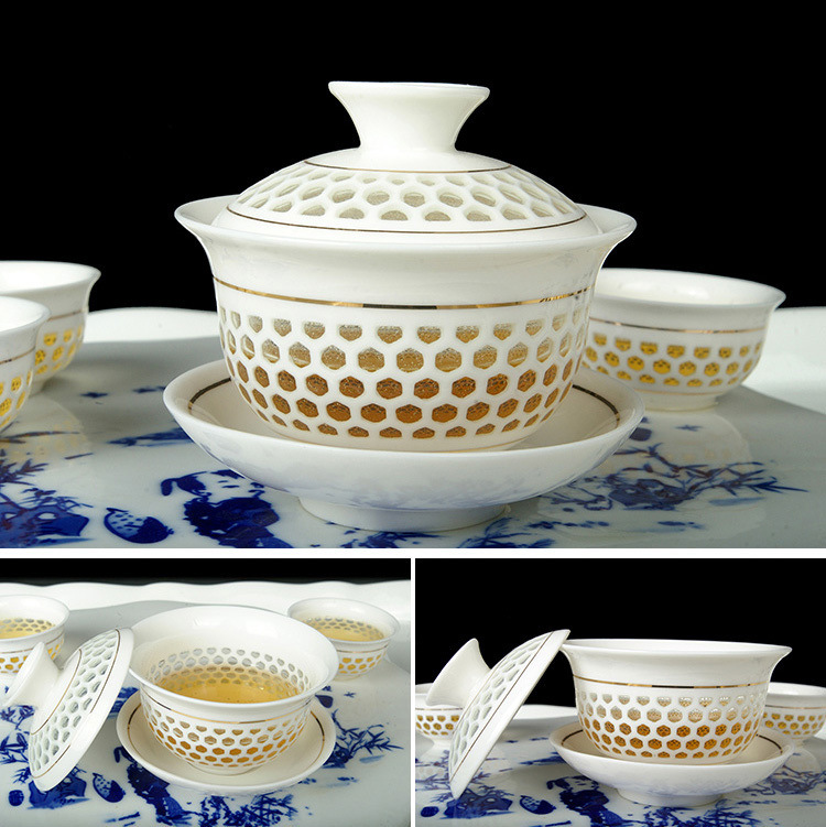 氷晶の精巧な陶磁器の茶器のセットは透かして青い花の金線の工夫の茶器の蓋の碗のお茶の杯のセットを詰めて郵送して国境を越えます。