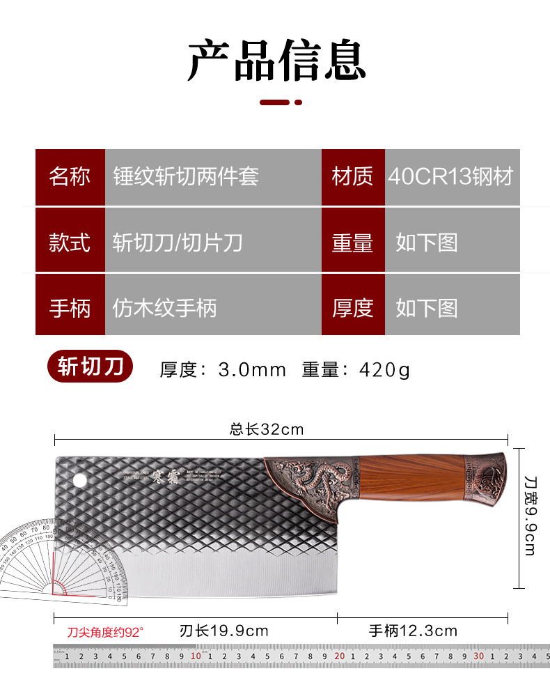 仕様 銅製龍彫りダイヤモンドスライスナイフ,銅彫り龍ダイヤモンドチョッピングナイフ,銅彫龍ダイヤモンド2点セット