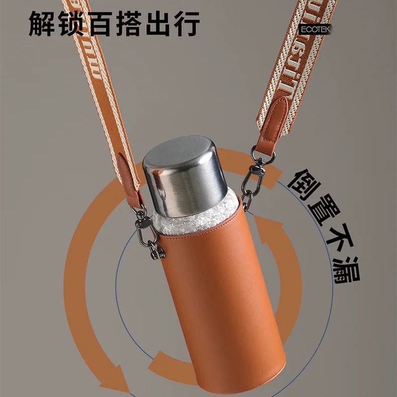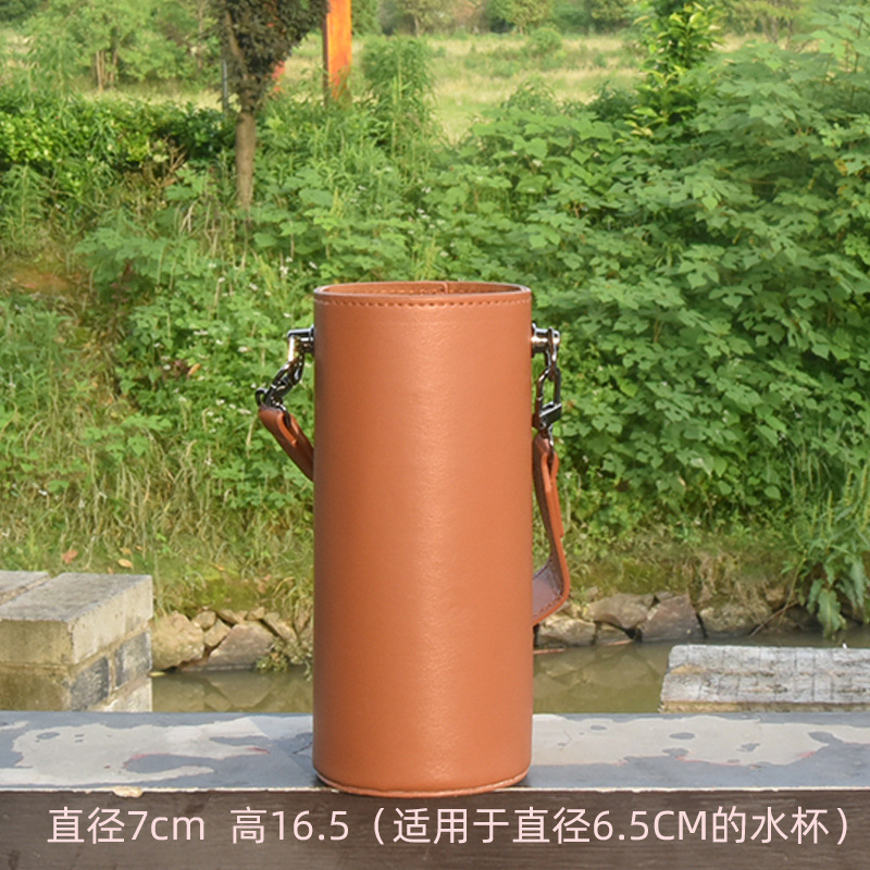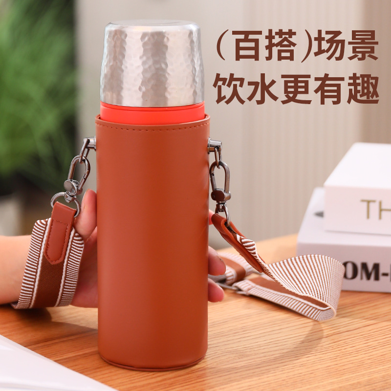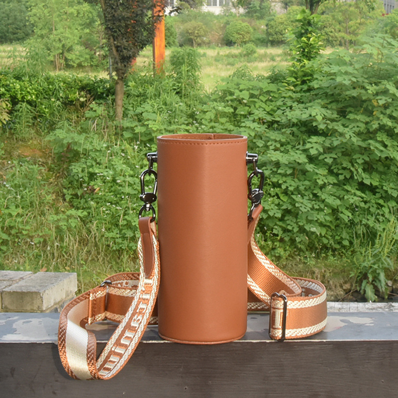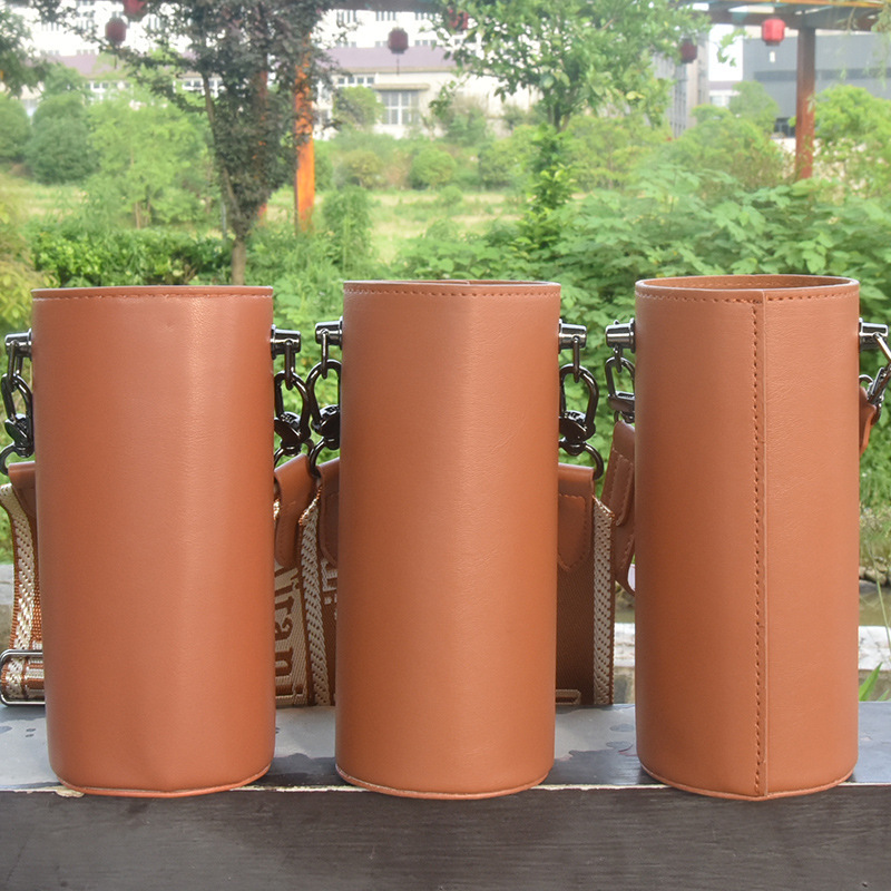 高級レザーカップカバー、魔法瓶カップ、チタンカップ保護カバー、ハンドルロープ付き、斜めストラップ、PUレザー、ロゴ印刷可能