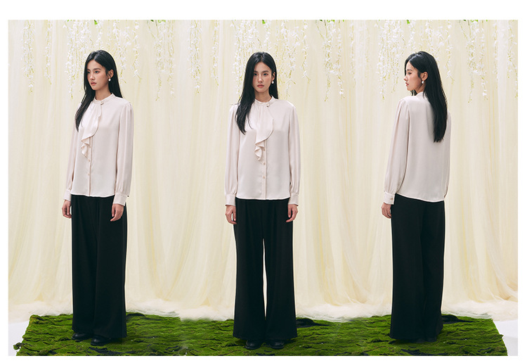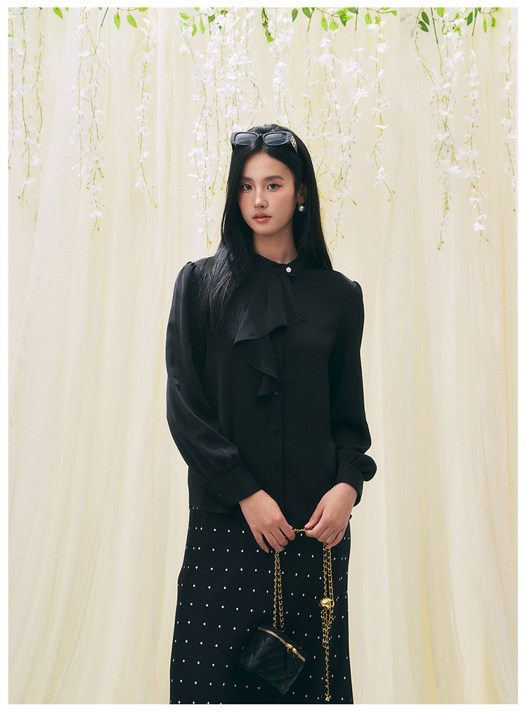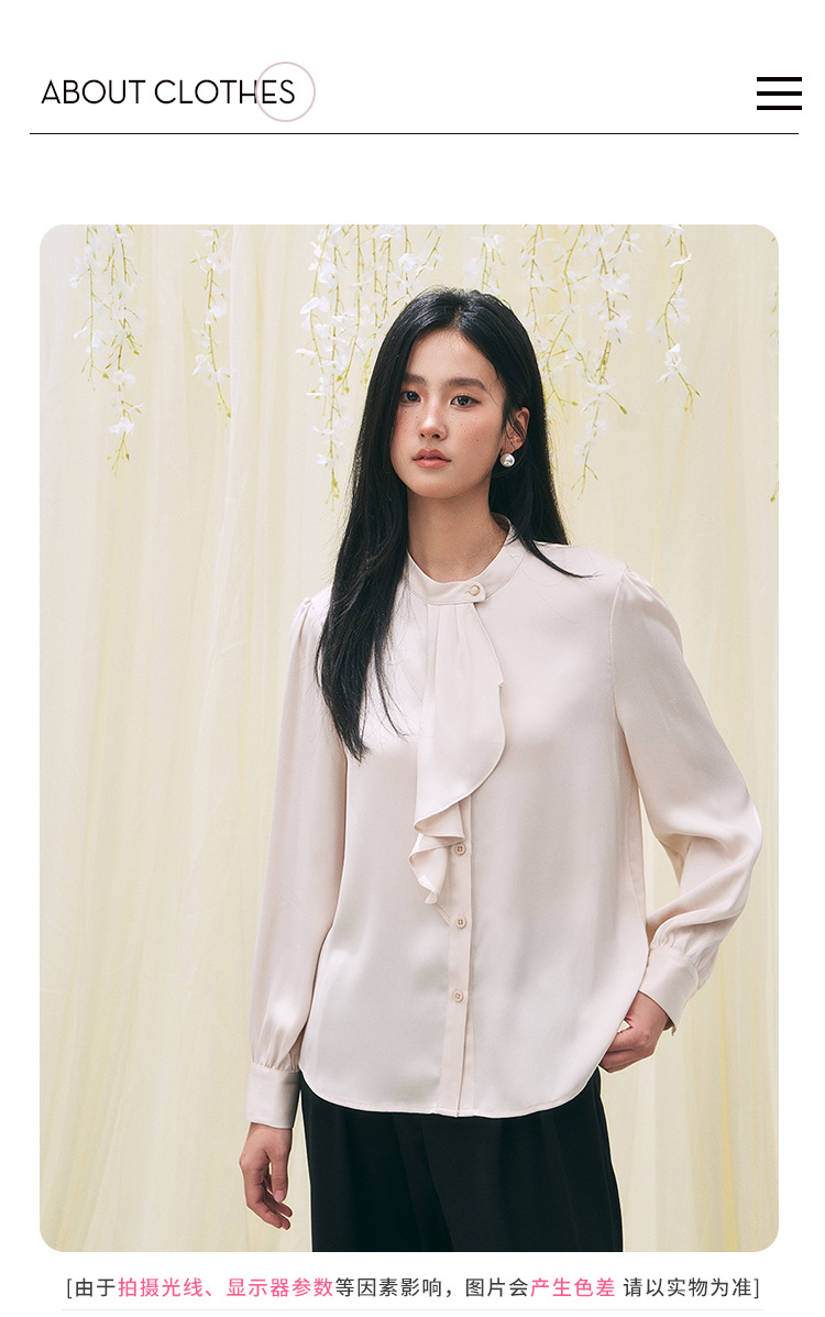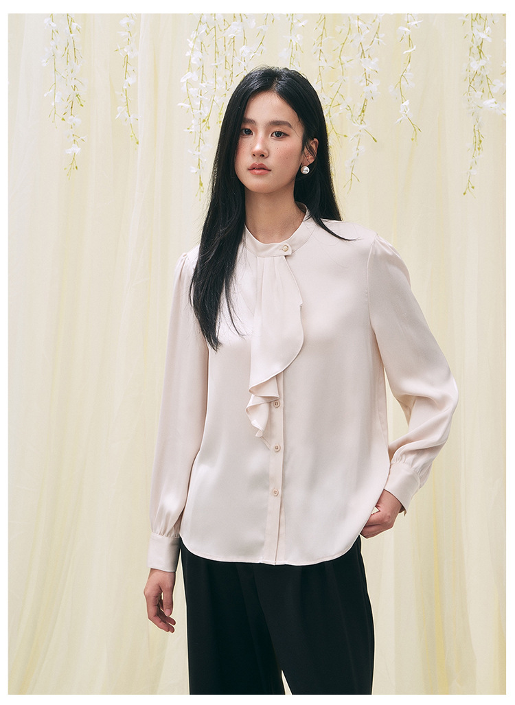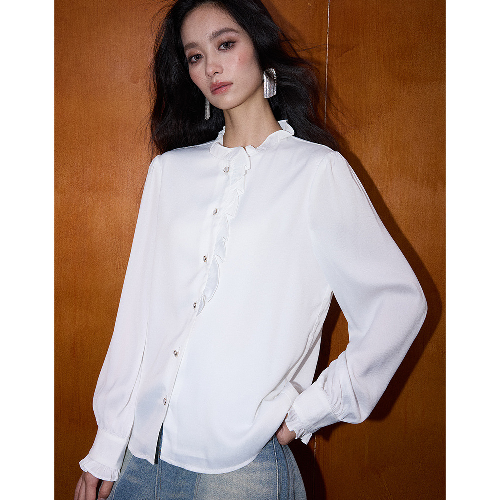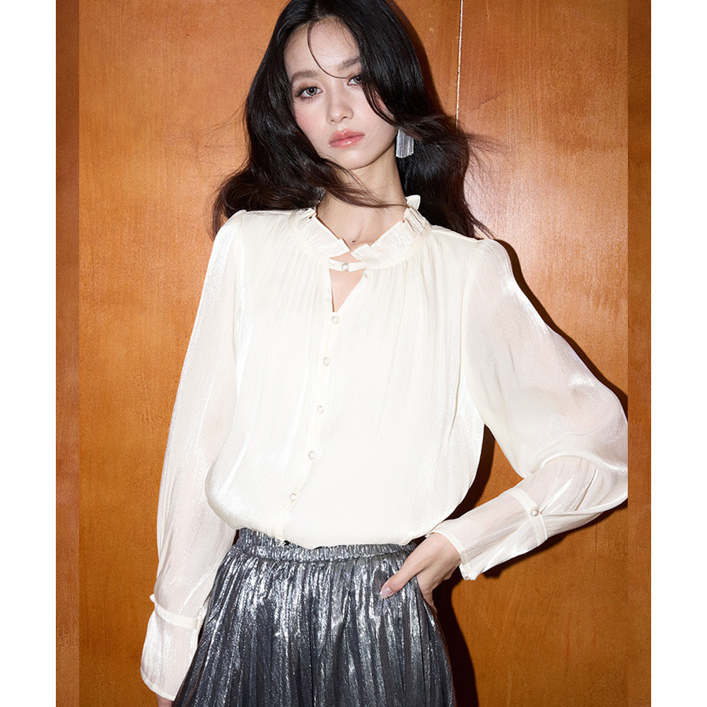 【盛都】26春新法式复古名媛风珠光木耳边立领气质长袖衬衫薄上衣