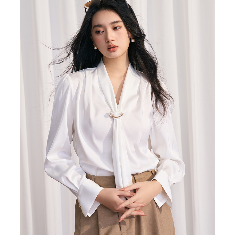 26春モデル 蝶結びリボン付き エレガントVネック サテン生地 着痩せ効果のある レトロフレンチスタイル 長袖シャツ レディース 7327