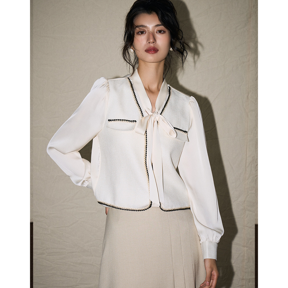[Shengdu] 25春の新作フレンチレトロセレブスタイルコントラストリボンリボン万能シャツトップ