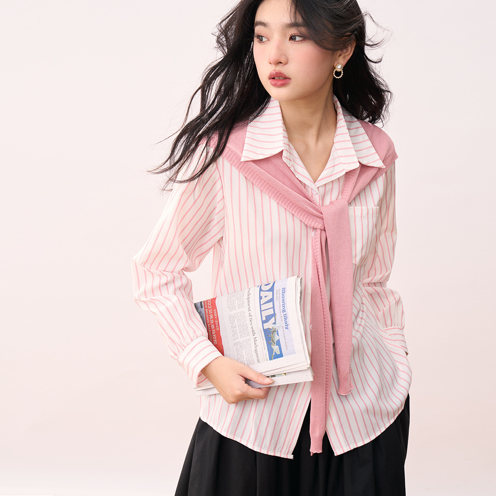 【盛都】26春新作 韓国風 フレンチガール ピンクストライプシャツ ショール付き カジュアル ゆったりトップス レディース