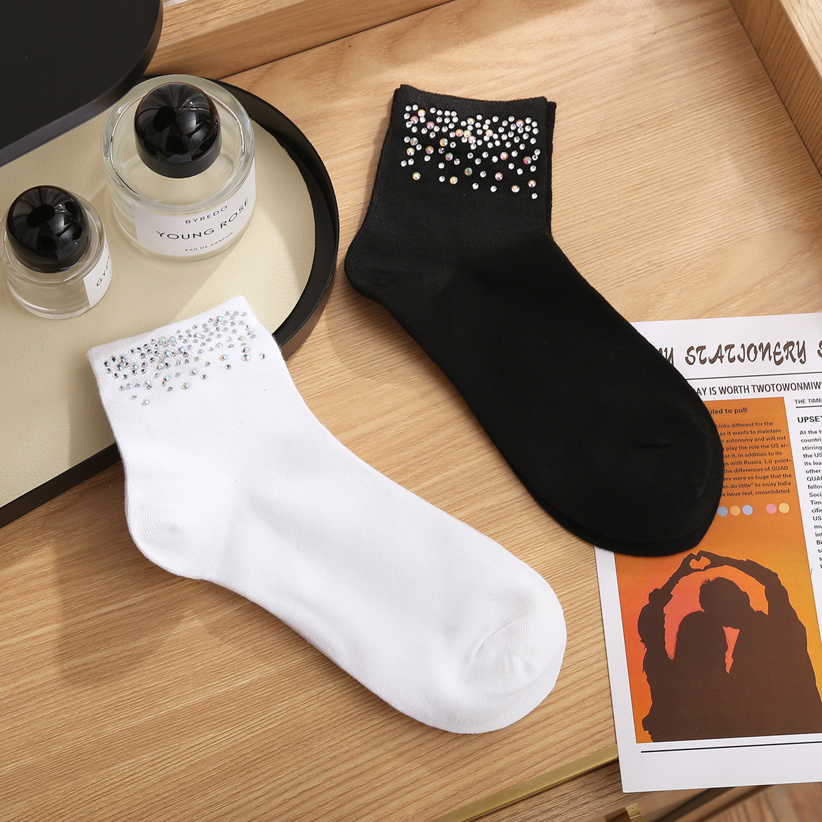 夏の新作薄手韓国風フルラインストーンキラキラミドル丈ソックス、おしゃれで万能、トレンドソックス、個性的なラインストーン装飾ソックス