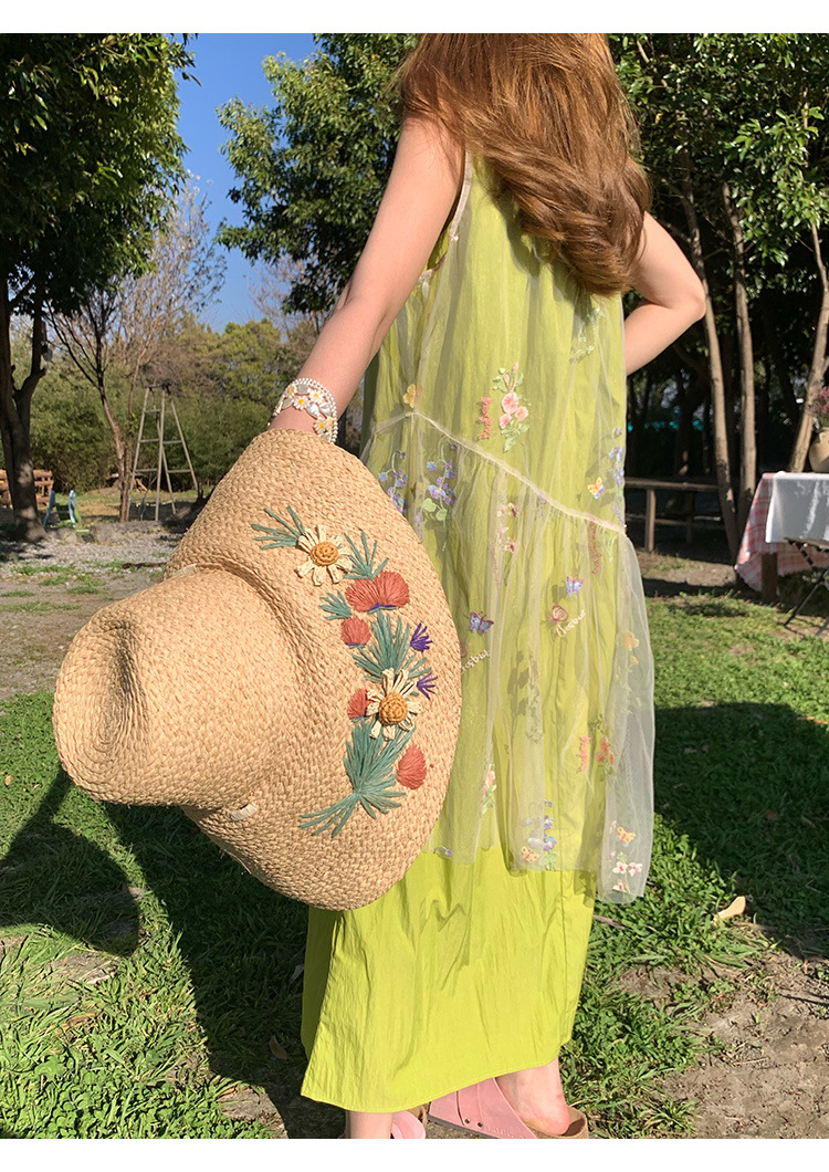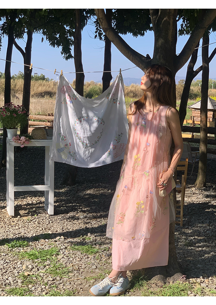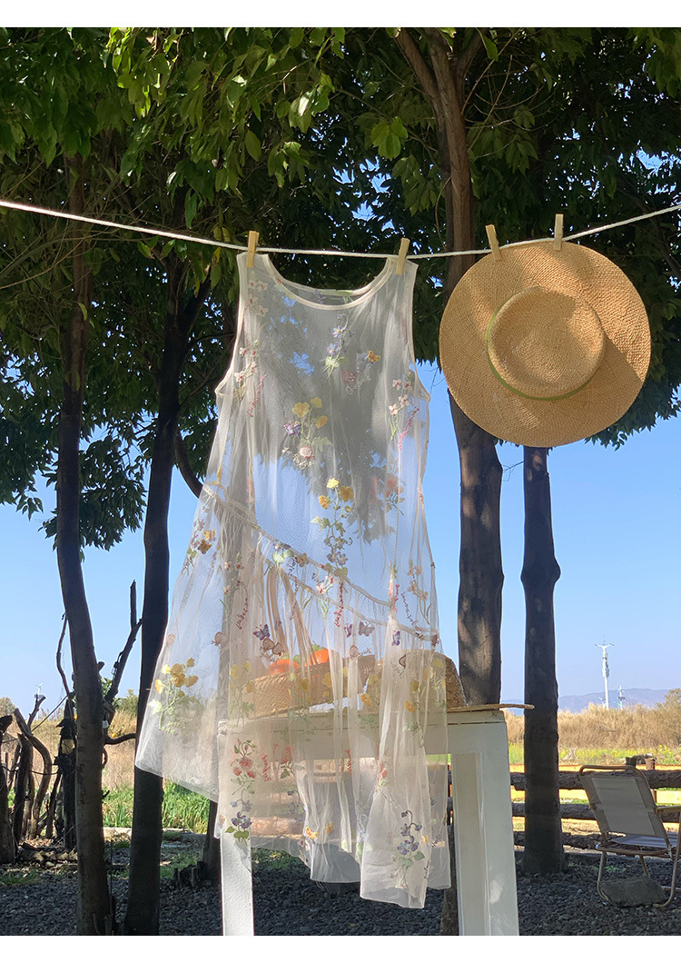 「蝶の花があふれている」ネットの刺繍のノースリーブのワンピースの女性の夏のゆったりとした重ね着のスカートのベストスカート