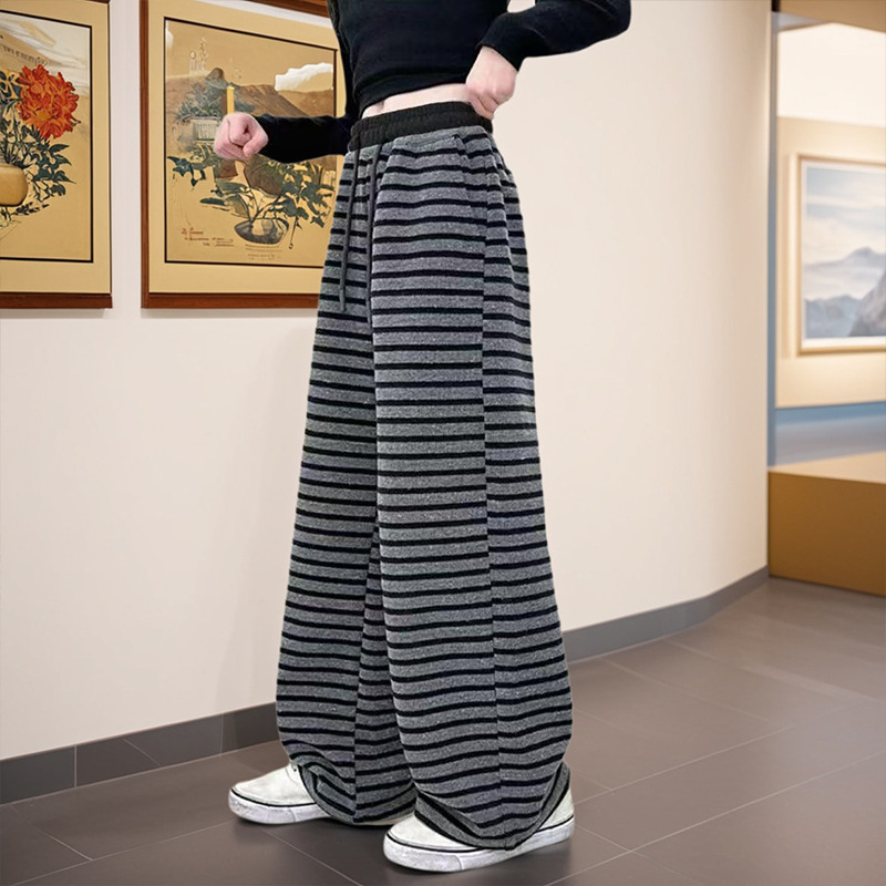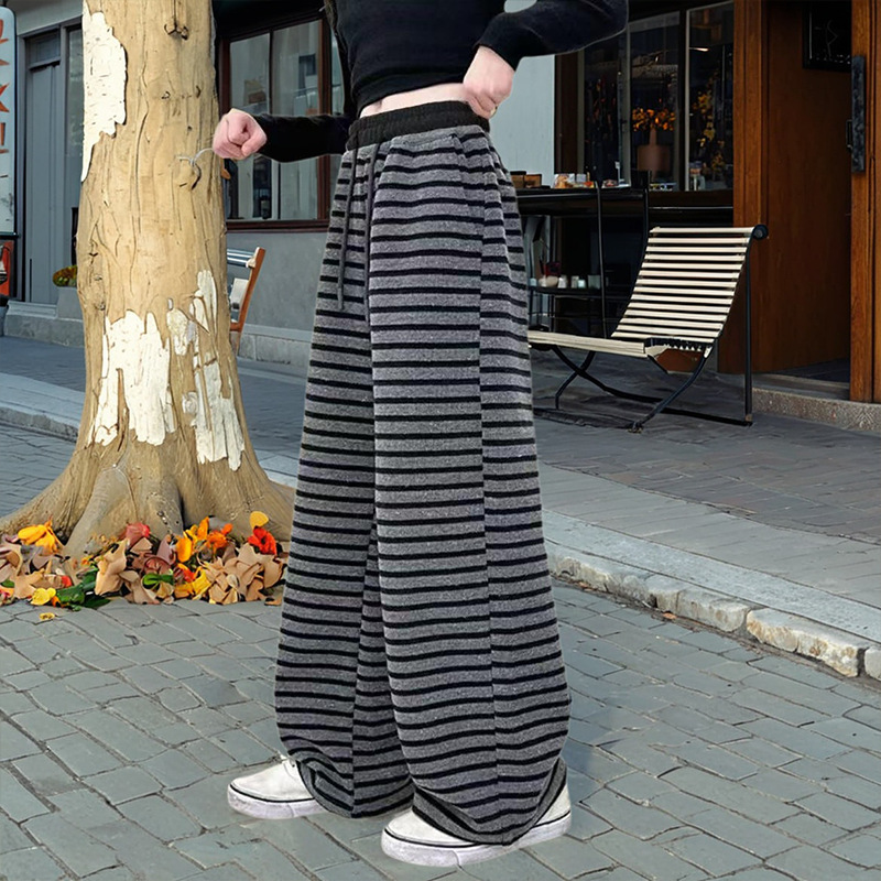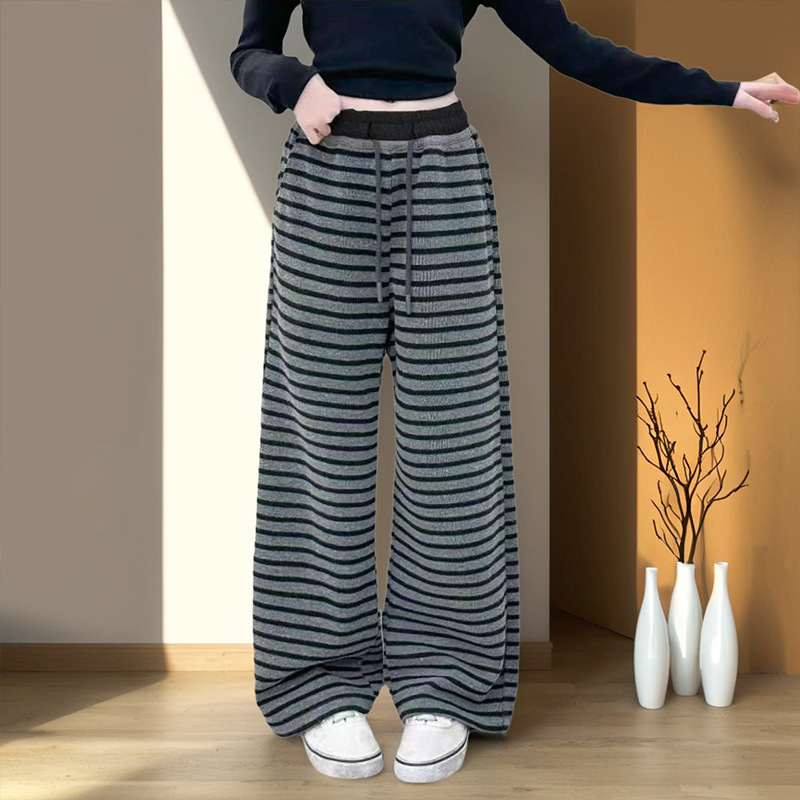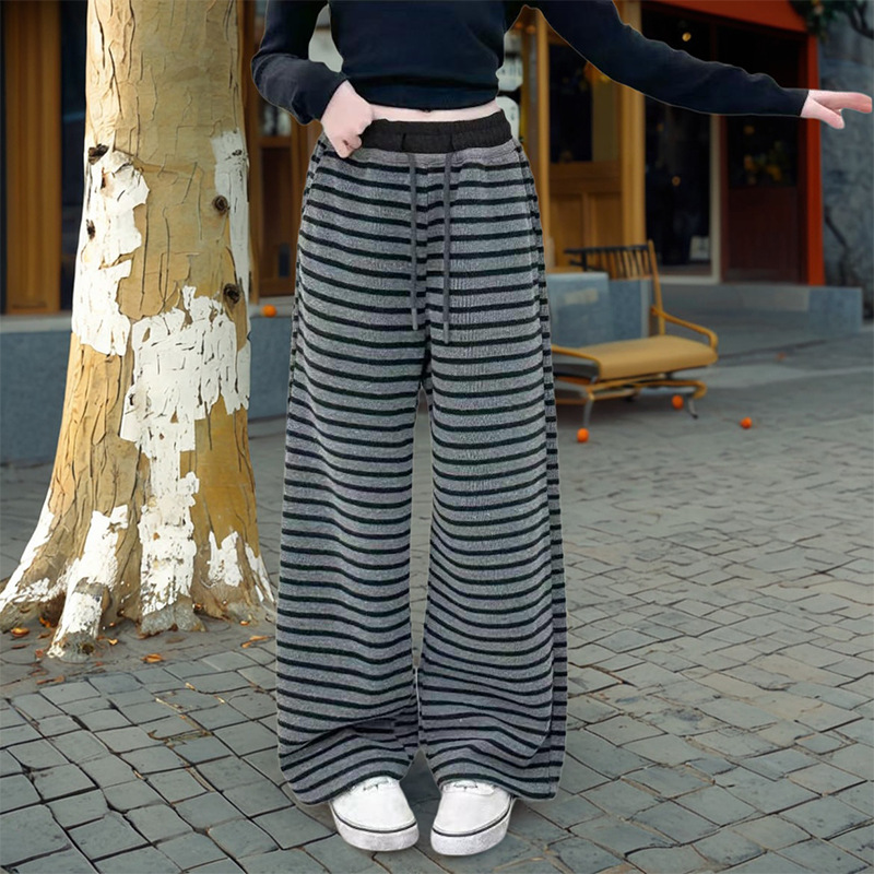 小个子复古条纹阔腿裤女春季2025新款垂感直筒显瘦休闲针织拖地裤
