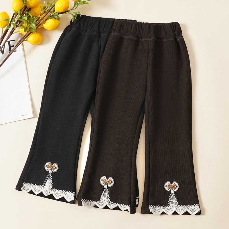 女の子の蝶結びのレースのラッパのズボンの現物の秋冬とベルベットのズボンの中の子供は厚いカジュアルなズボンの子供服の卸売りをします。