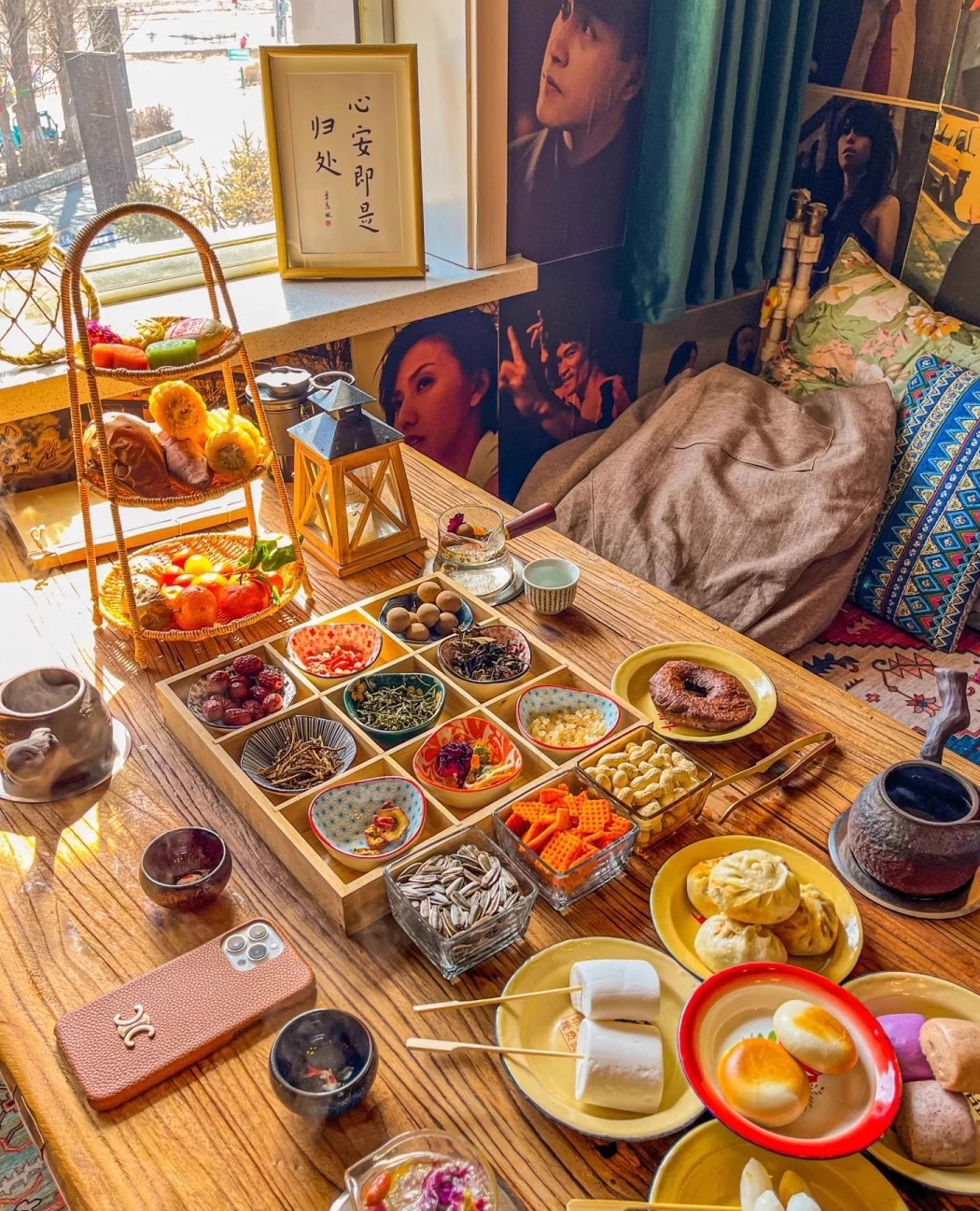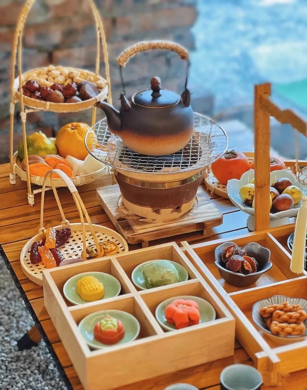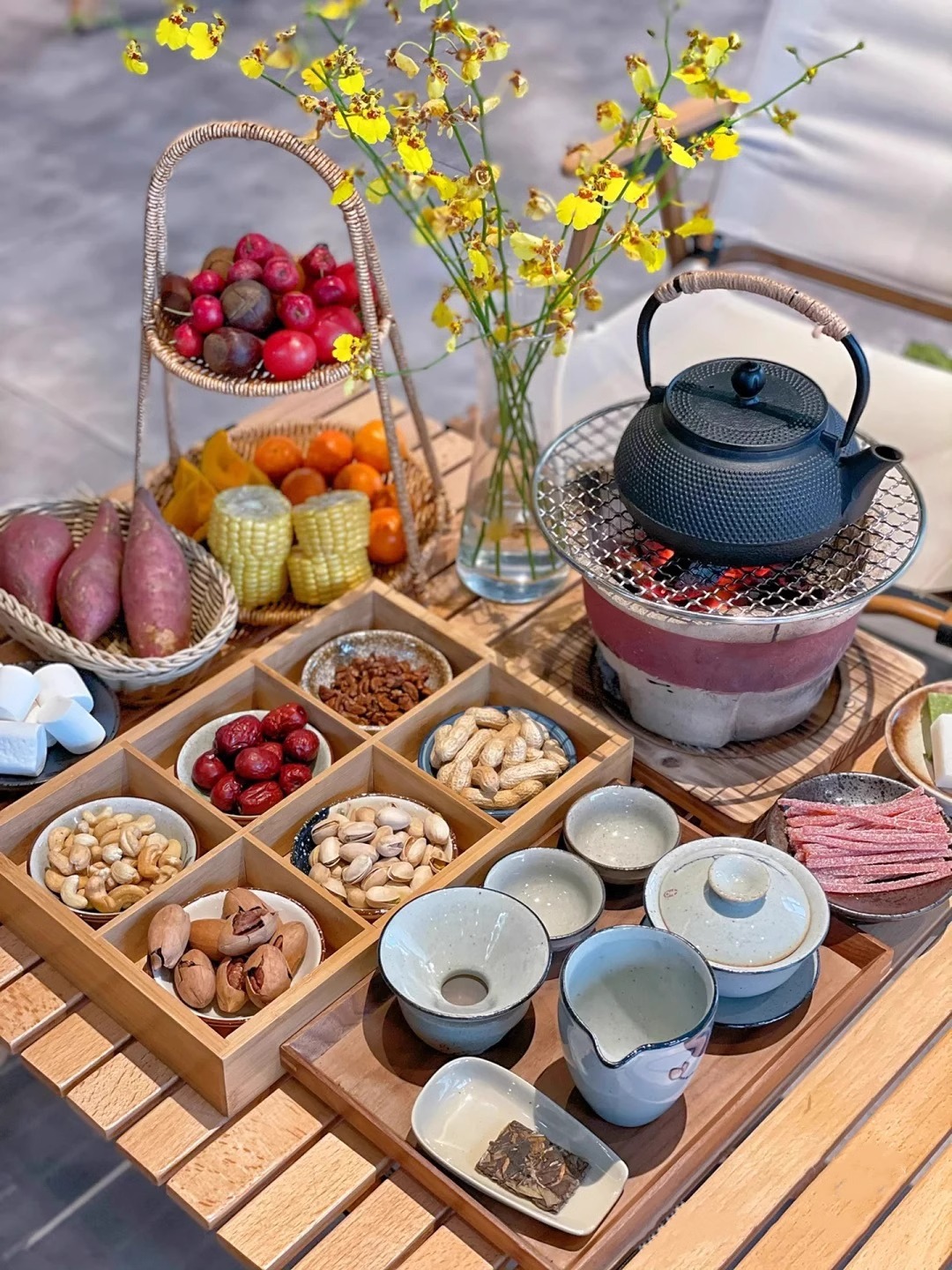 リビングルームのお茶とお菓子のドライフルーツ皿鍋の格子のおかずの盛り合わせ皿九宮格竹のトレーの食器