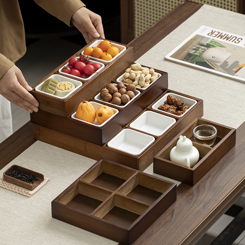 2025新型囲炉裏煮茶トレー四宮格木質九宮格乾果皿果物皿お菓子皿