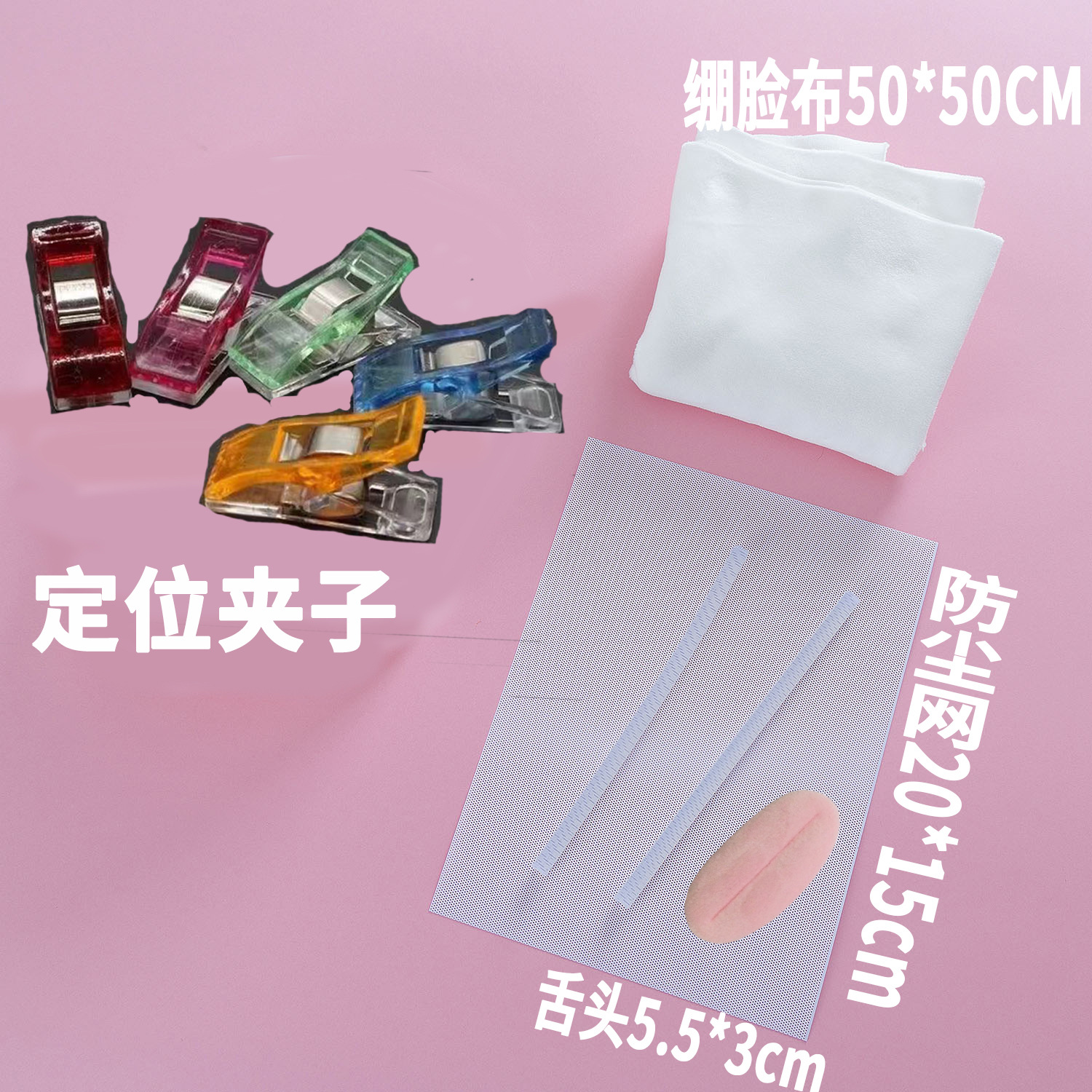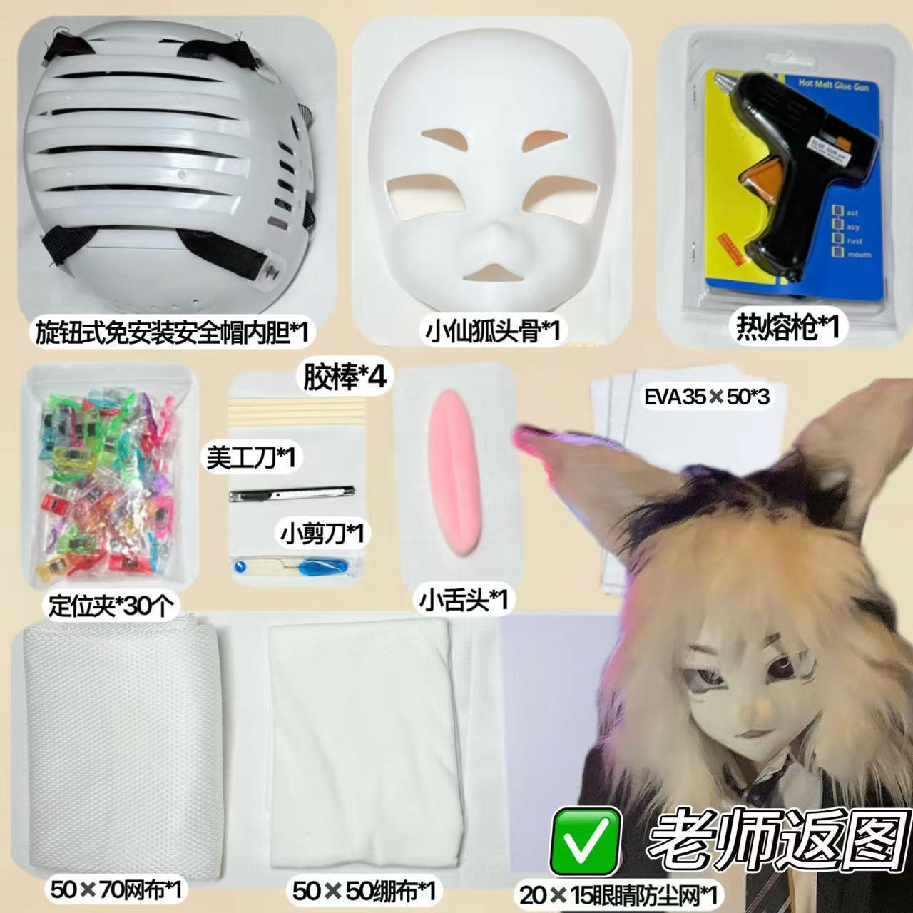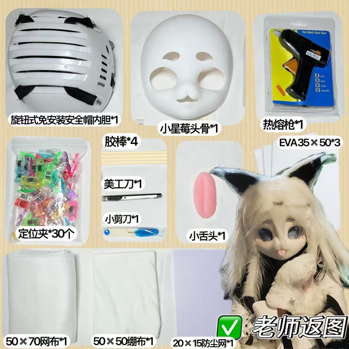 尺寸 日系犬科28*26cm,kig系小星莓莓25*21cm,kig系小仙狐理25*19cm,旋钮式免安装头壳内胆,三明治网孔布50*50cm,EVA泡沫板35*50cm,随机图案眼瞳5cm*一对,绷布50*50cm,定位夹*50个,无图案防尘网15*21cm,兽装粉色小舌头