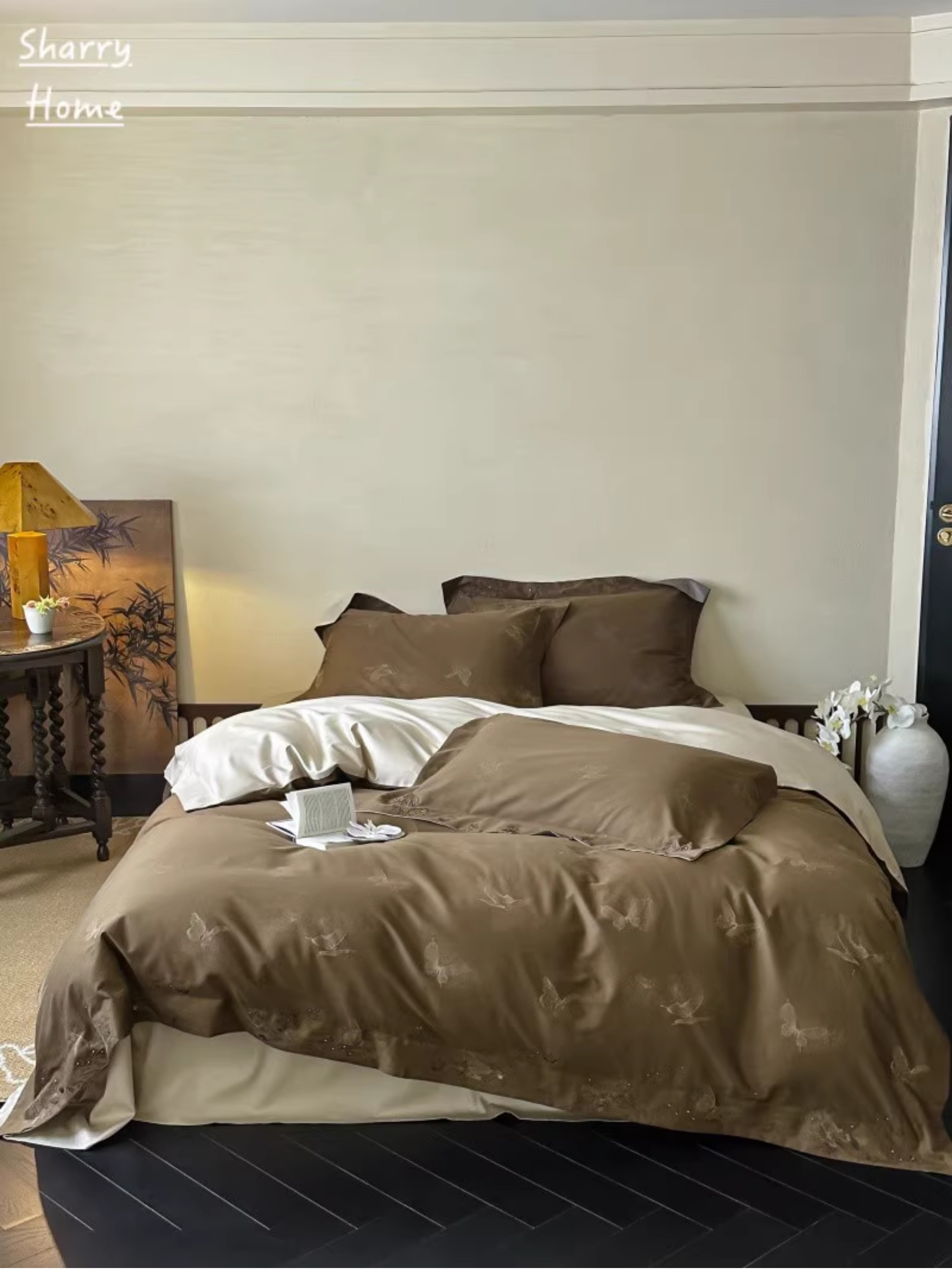 宋代の美学中国式の復古風の蝶の純綿の綿の功のサテンのラクダの紫色のシーツの4つのセットの寝具