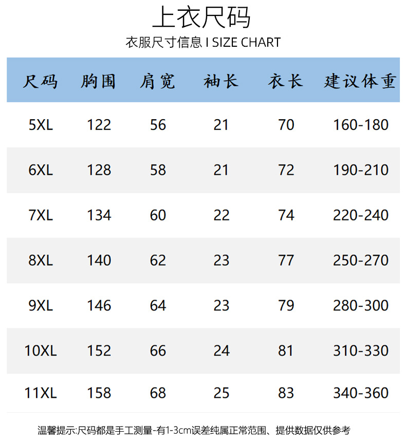 5XL(160-180),6XL(190-210),7XL(220-240),8XL(250-270),9XL(280-300),10XL(310-330),11XL(330-360)