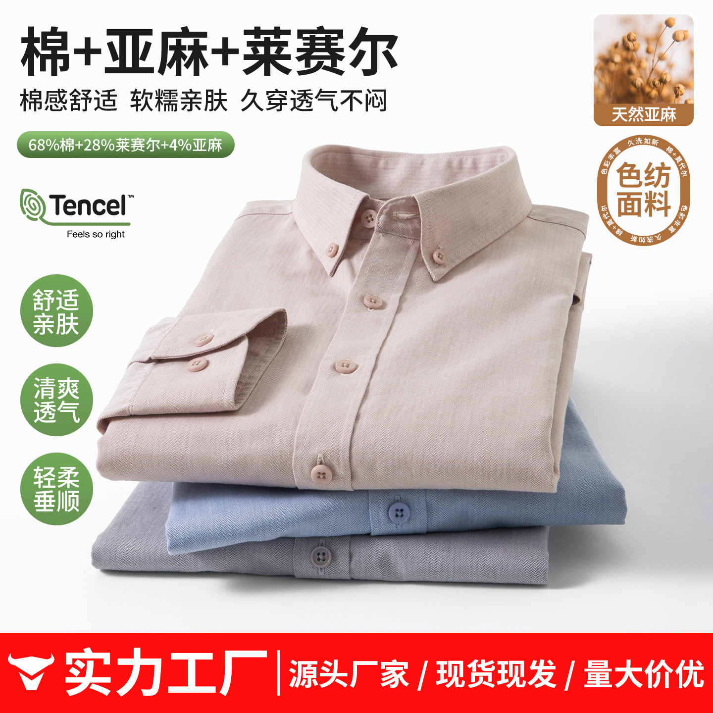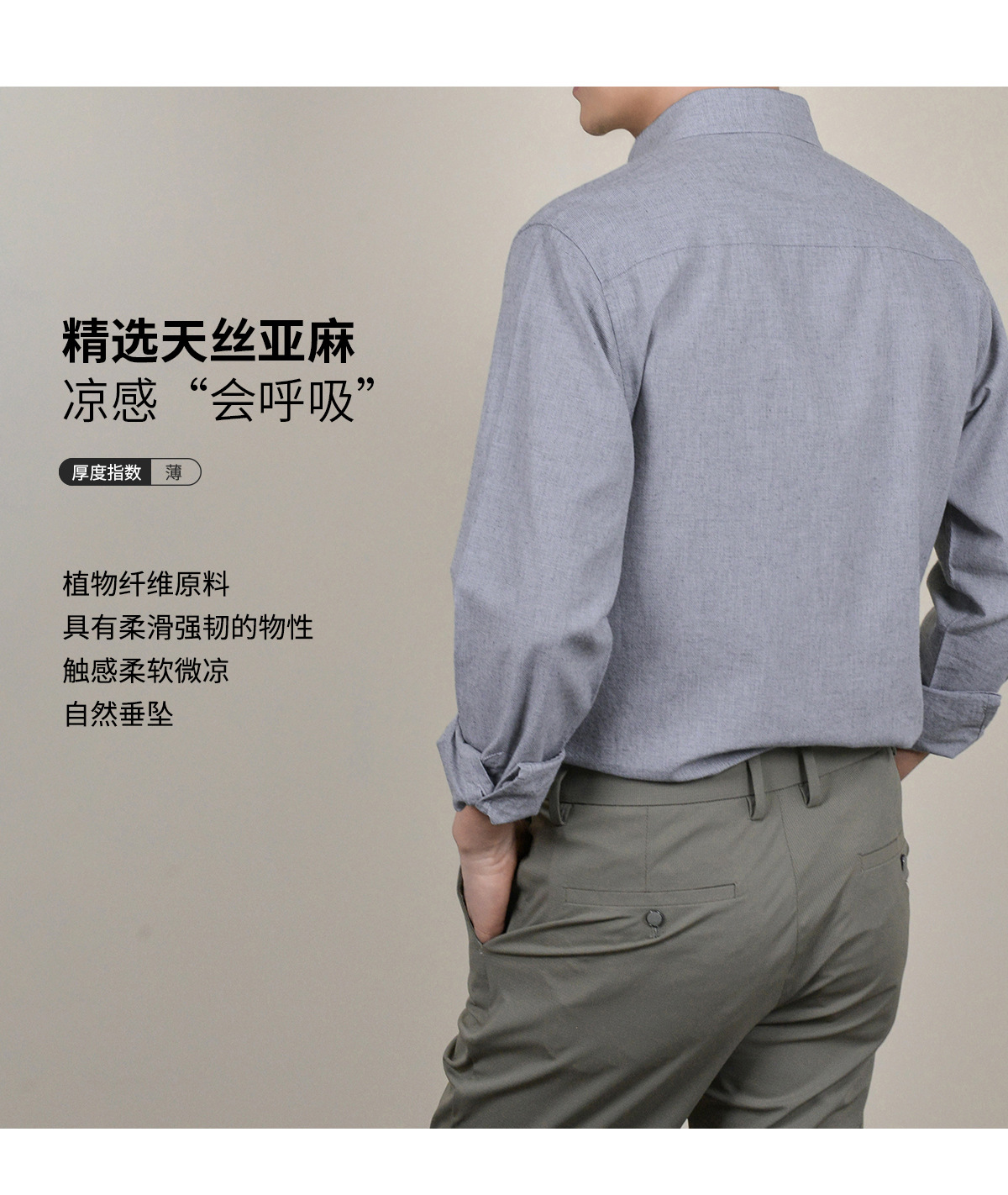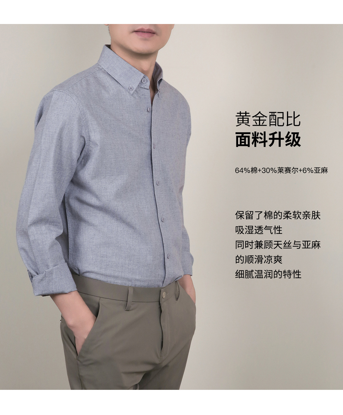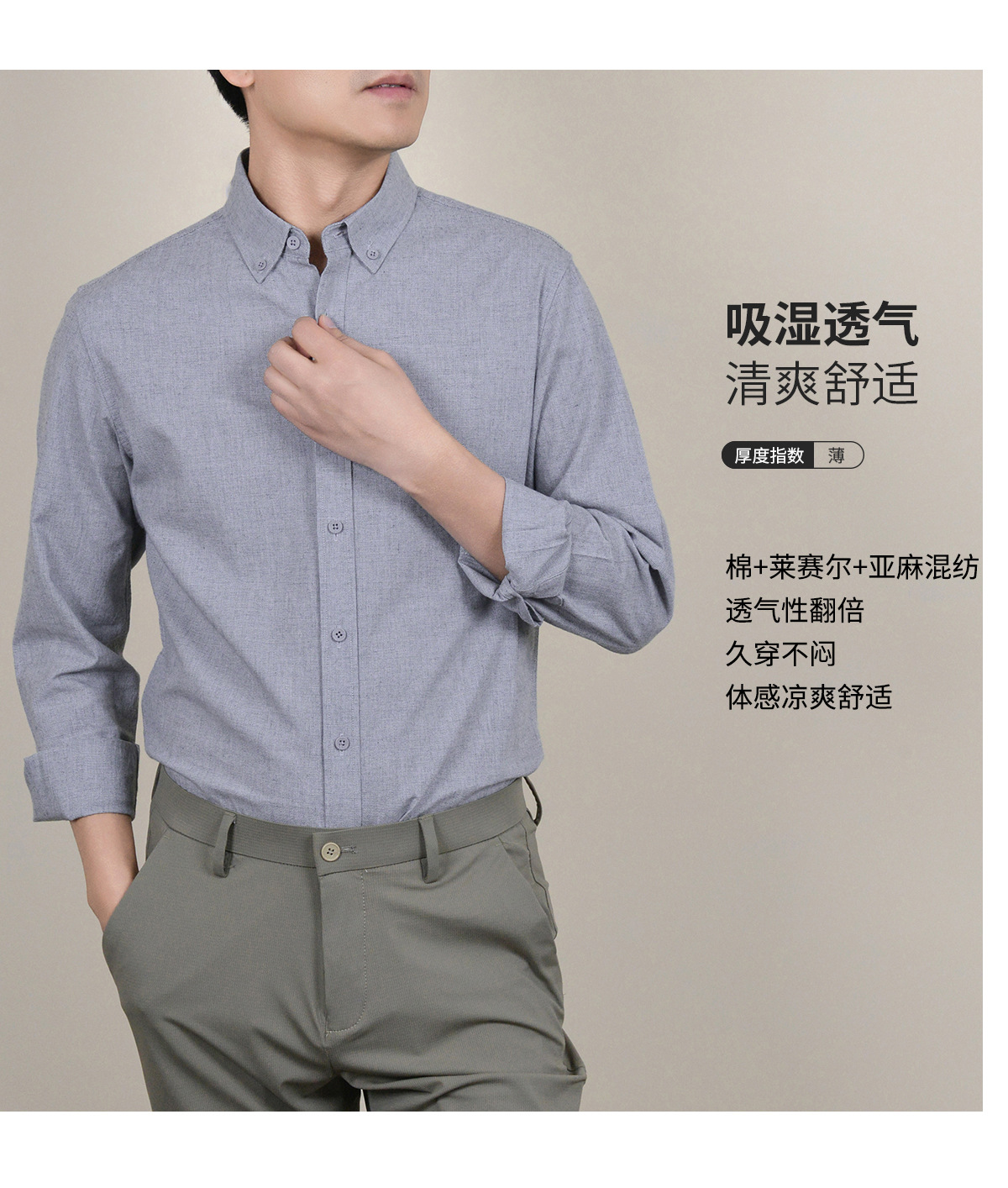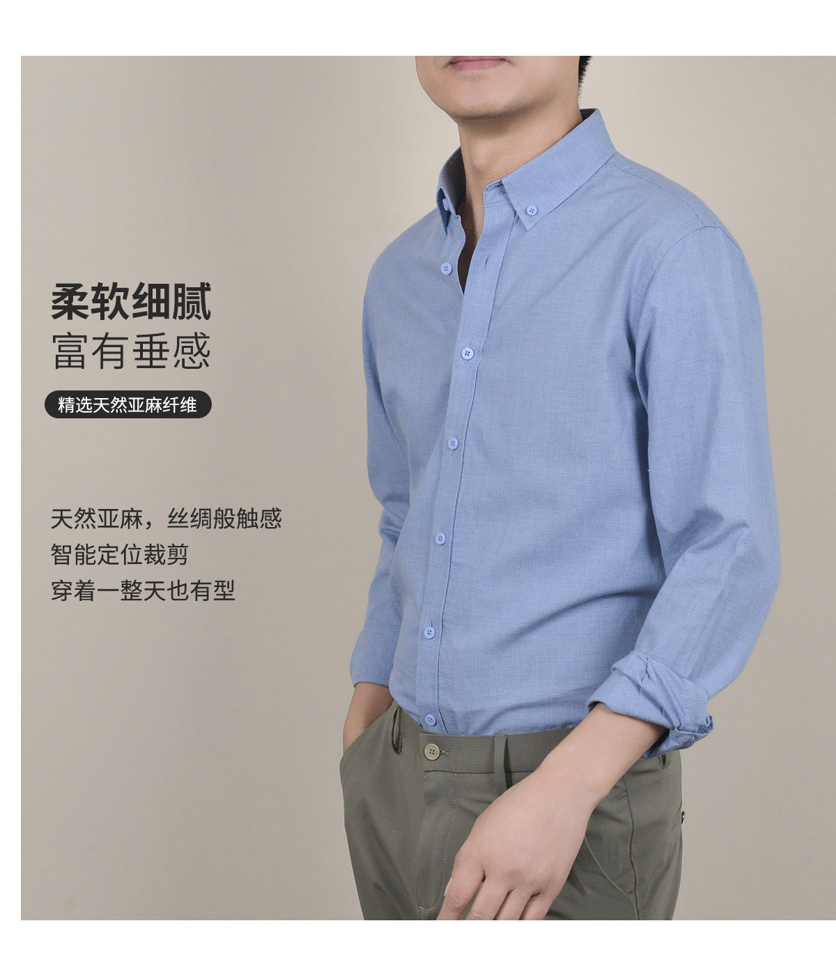 【亚麻+莱赛尔】纯色男式衬衫新款长袖人字纹休闲商务男士衬衣