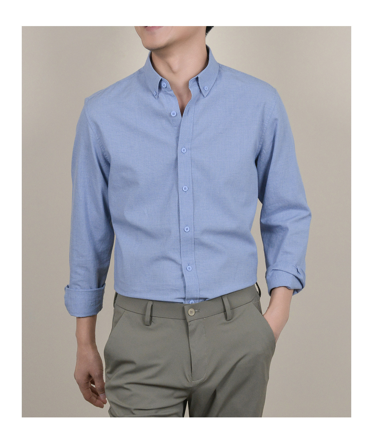 メンズシャツ長袖ビジネスカジュアル青中年男性リネン純色2025春新作メンズシャツ