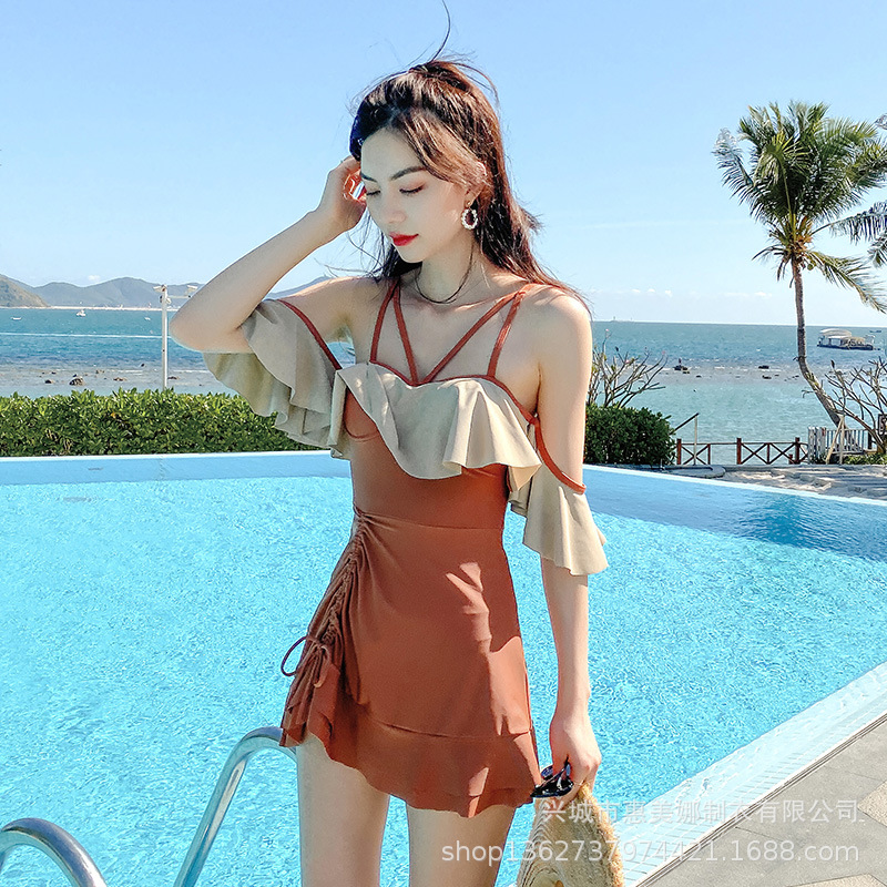 メーカー直供2023新型アマゾンセクシー連体キャラメル色韓国ins蓮葉辺水着卸売り