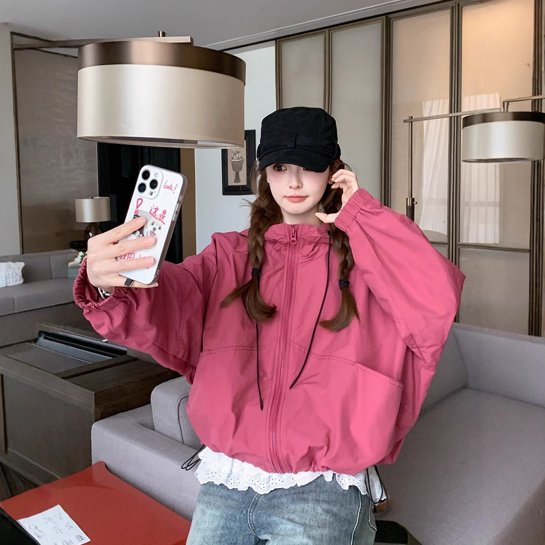 フード付きショートスポーツジャケット女性のカジュアルルーズソリッドカラージッパージャケット春と夏の新しい多用途日焼け防止服