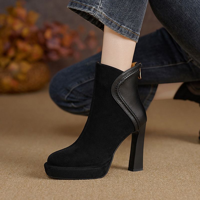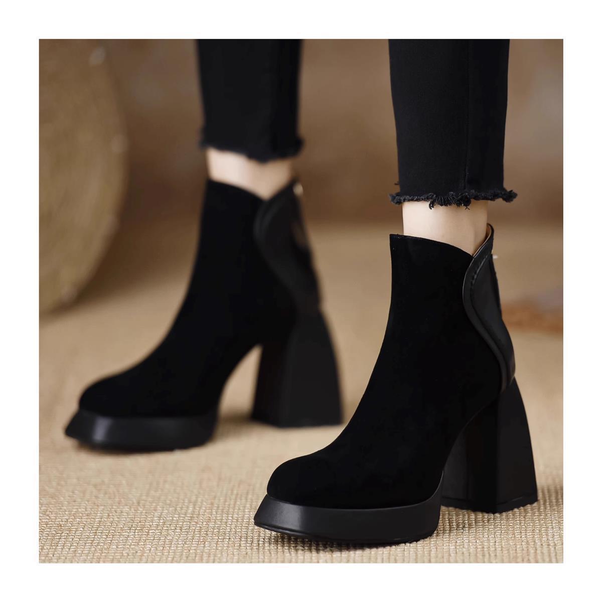 复古防水台粗跟短靴2025秋冬新款后拉链圆头厚底高跟鞋绒面时装靴