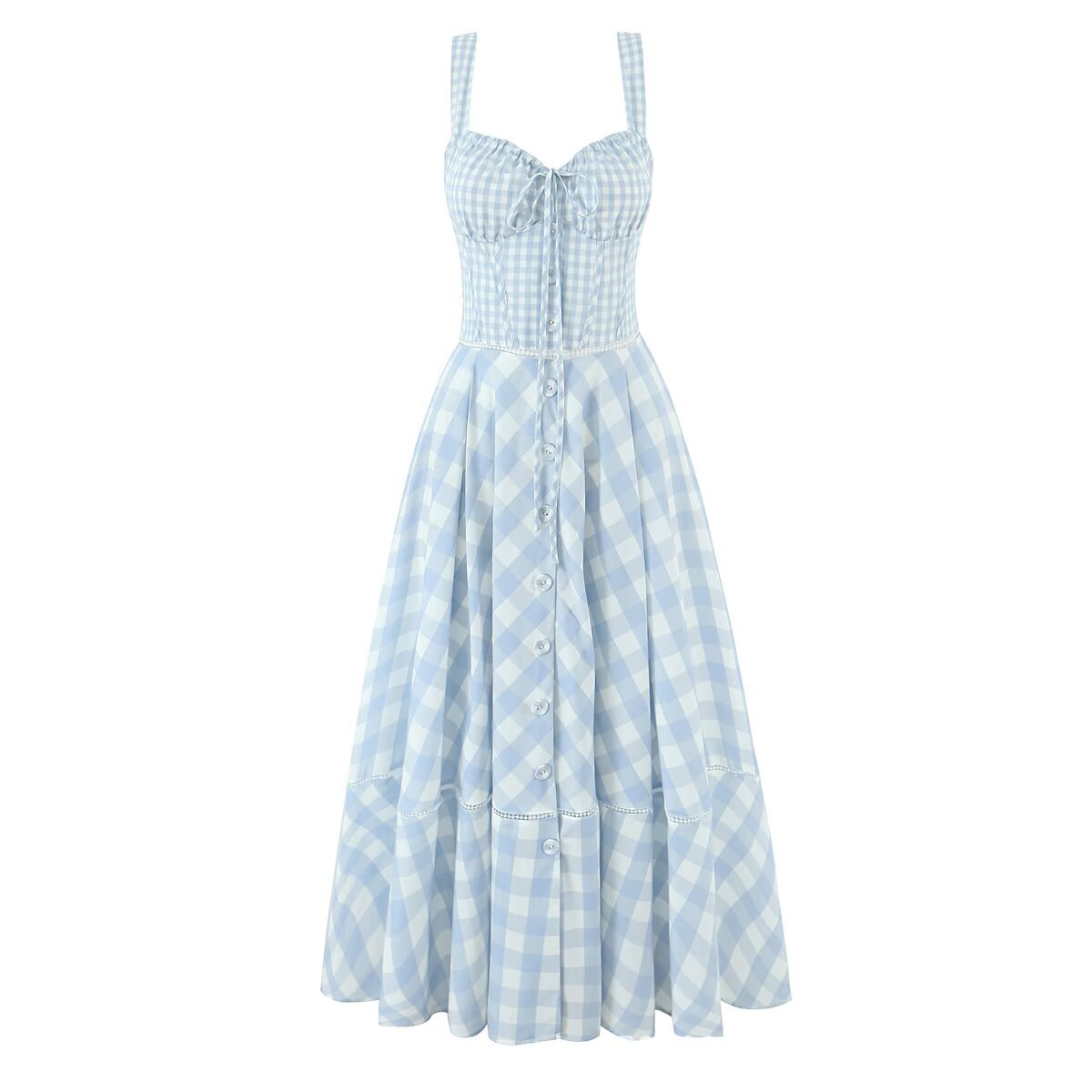 ハウスと同じスタイルのフレンチスイートブルーチェック柄エレガントなウエストタイデザインサスペンダーワンピースロングスカート