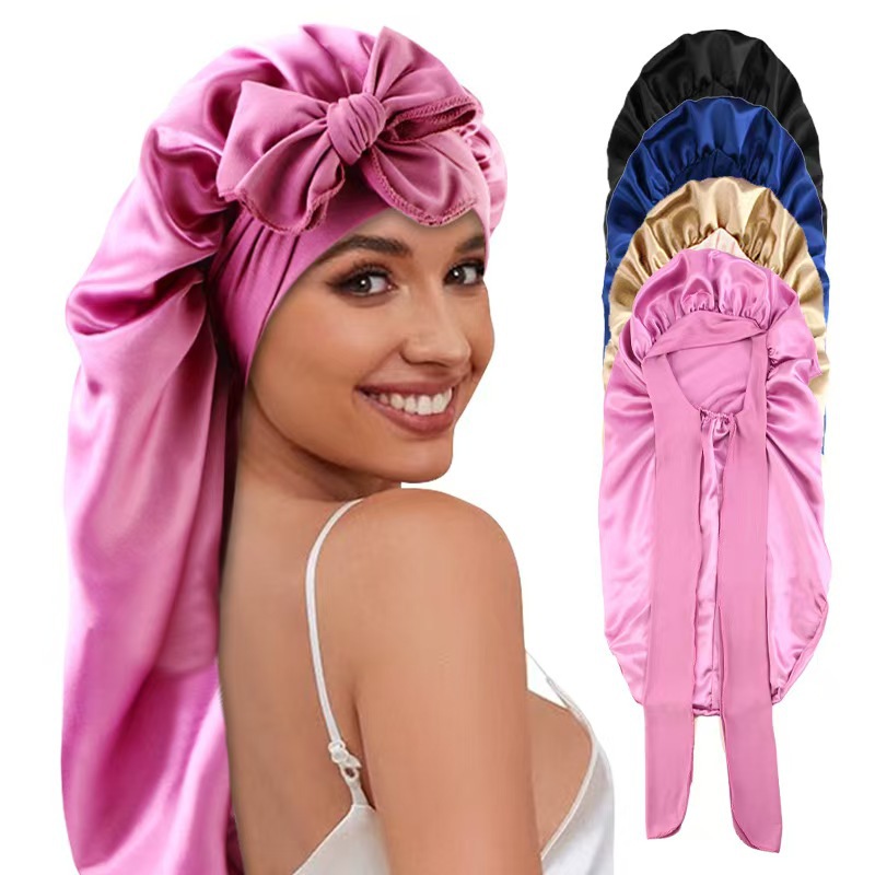 仿真丝蝴蝶结长尾睡帽护发头巾帽弹力飘带纯色色丁帽跨境热销
