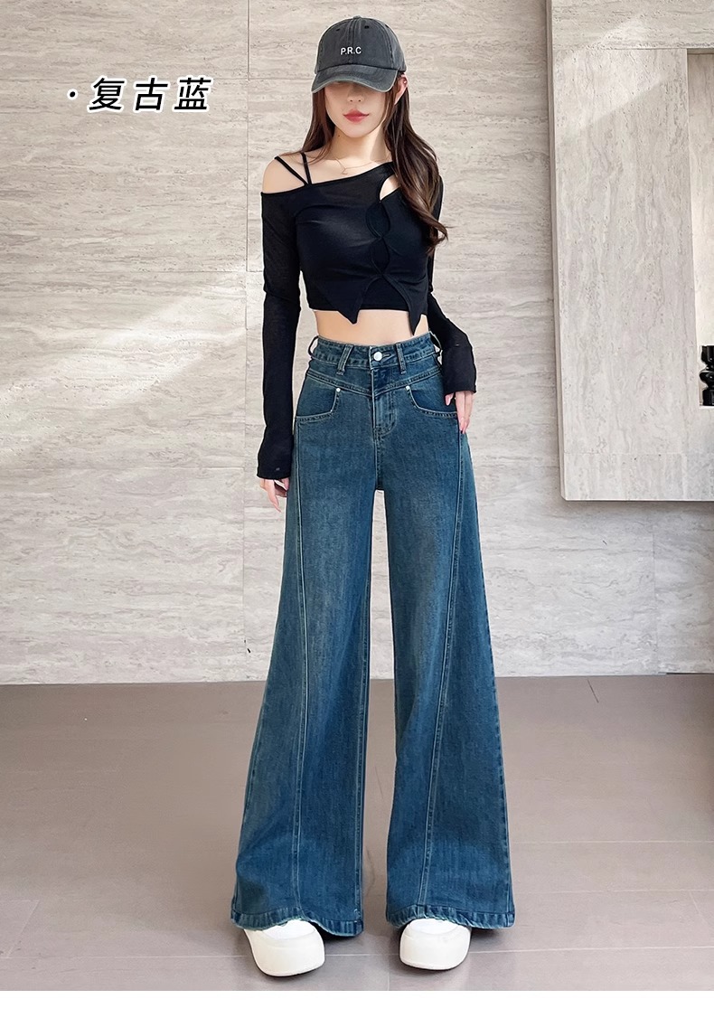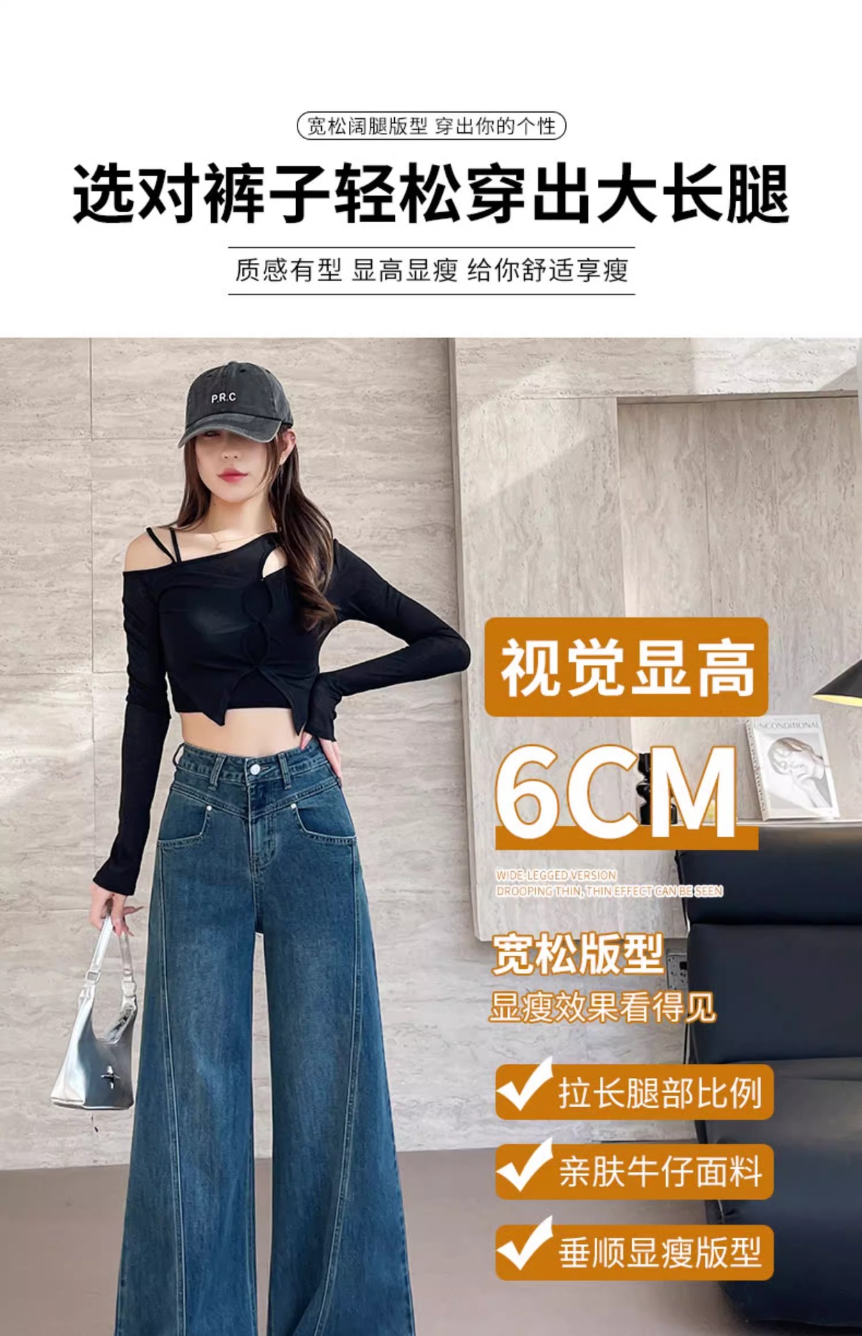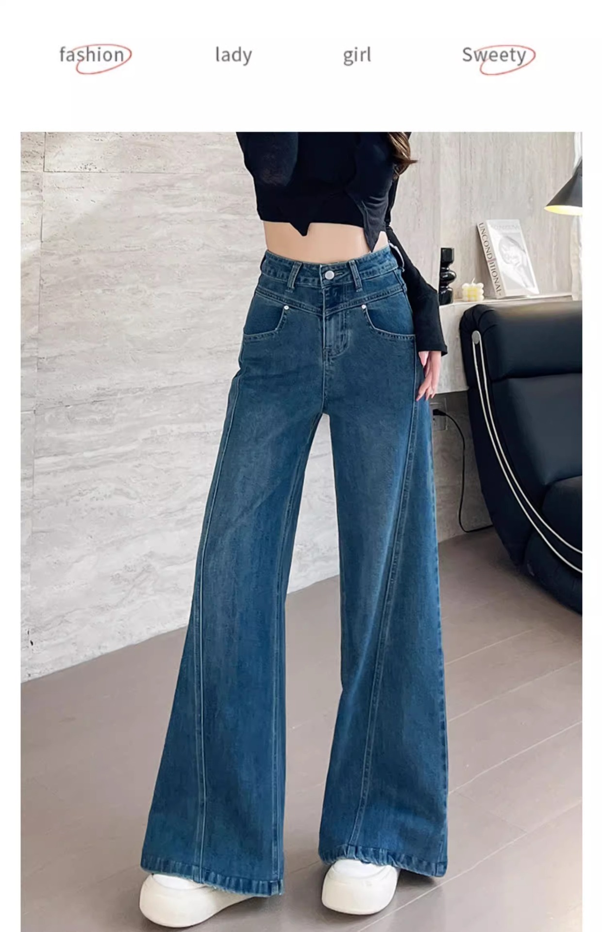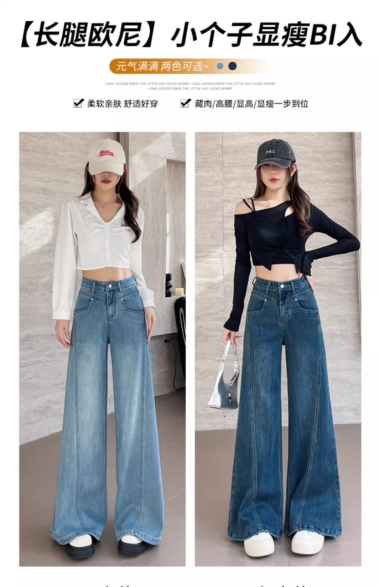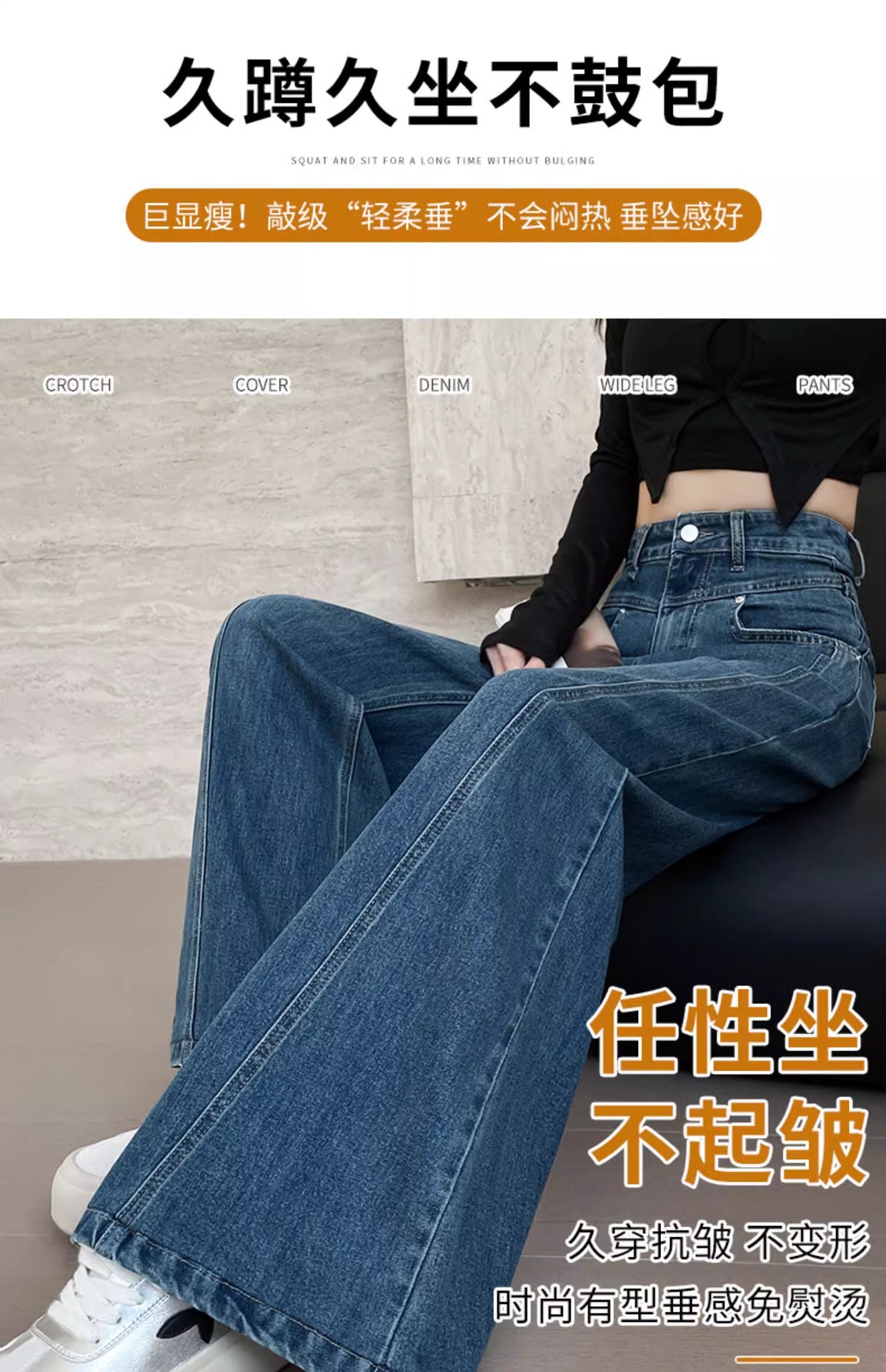 复古蓝阔腿牛仔裤女秋季2025新款高腰宽松时尚小个子拖地直筒裤子