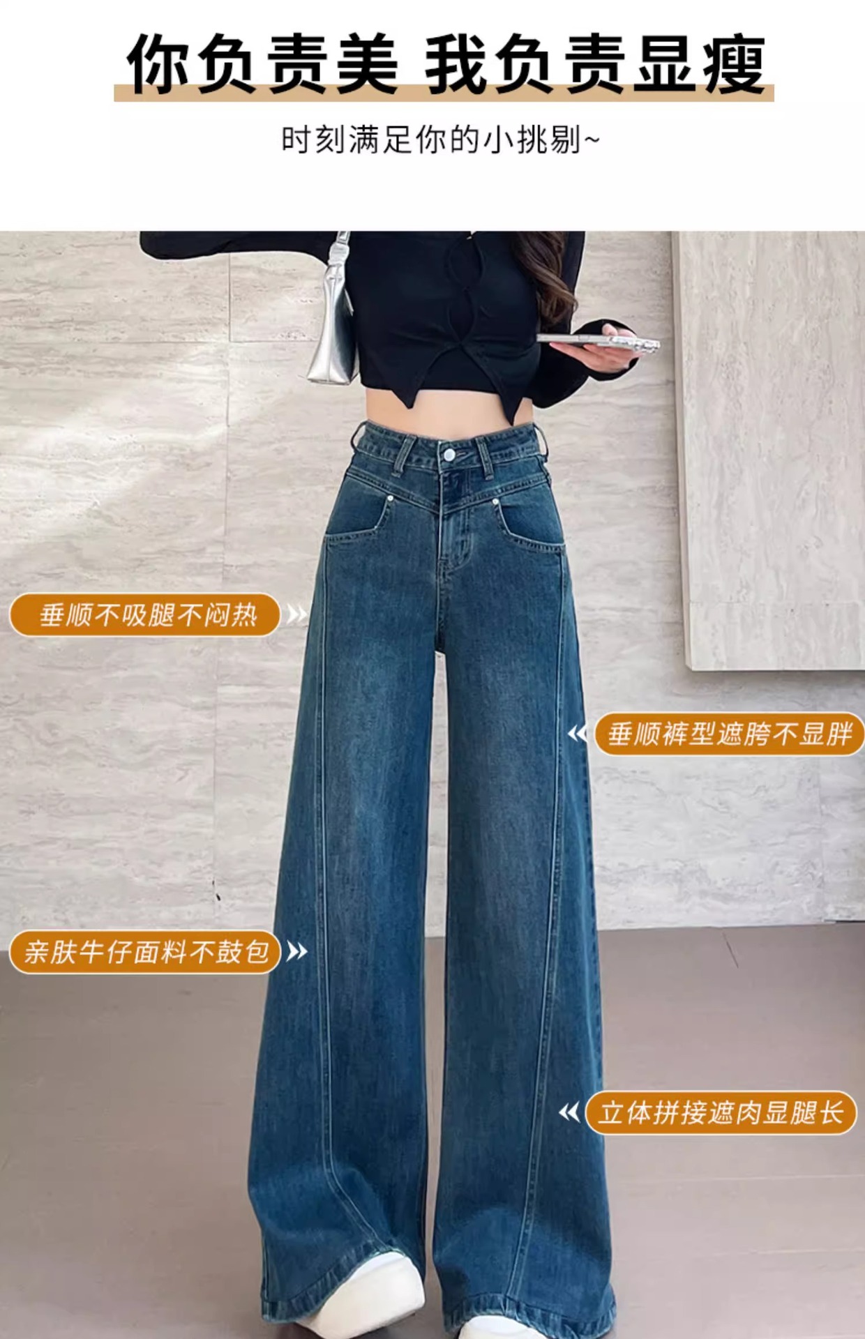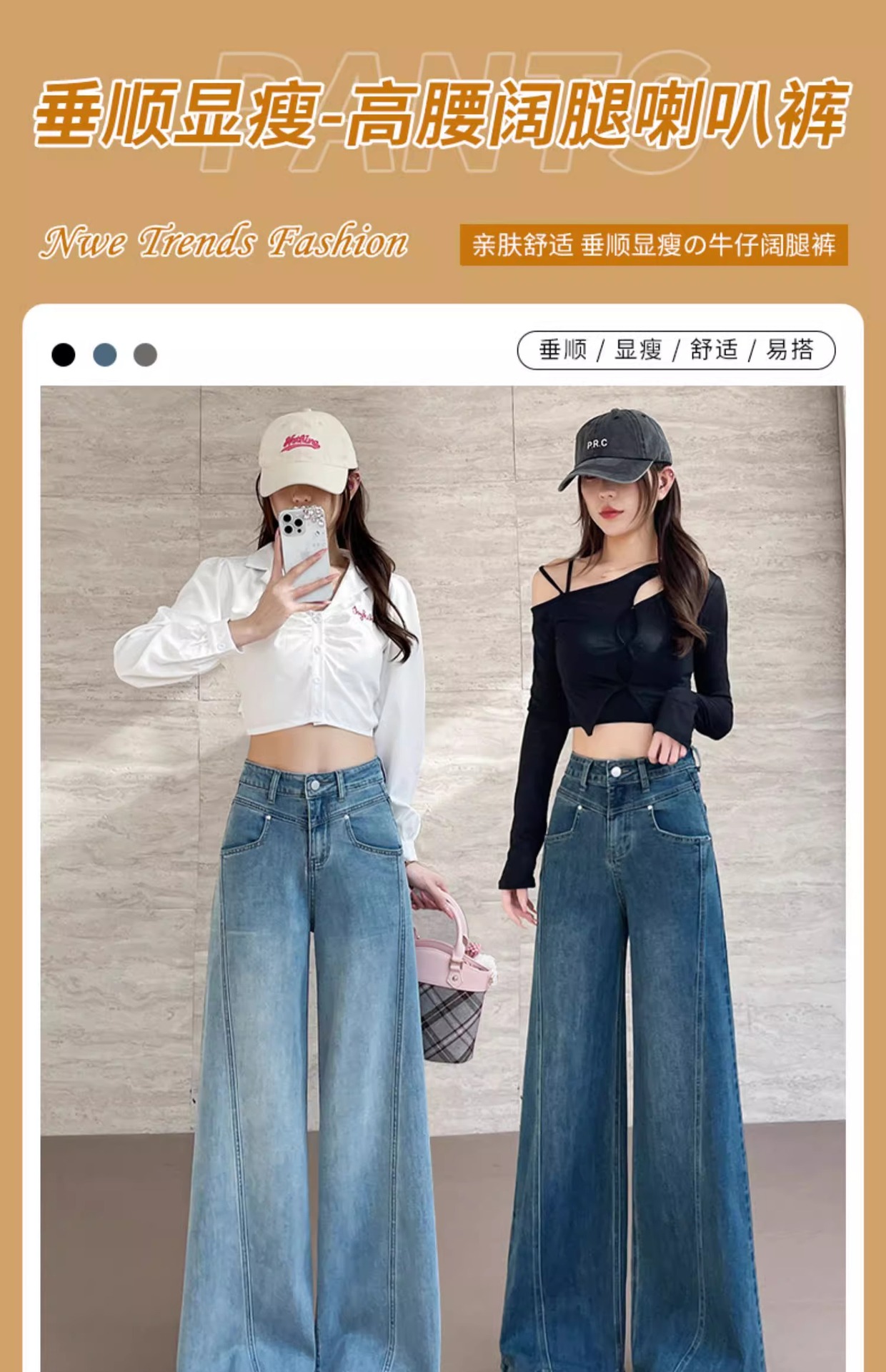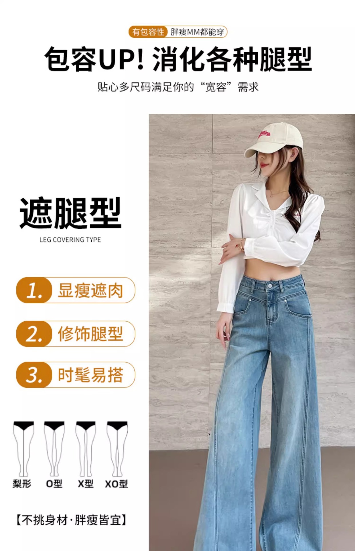 浅蓝色大阔腿牛仔裤女秋季2025新款侧边拼接遮胯小个子弹力喇叭裤