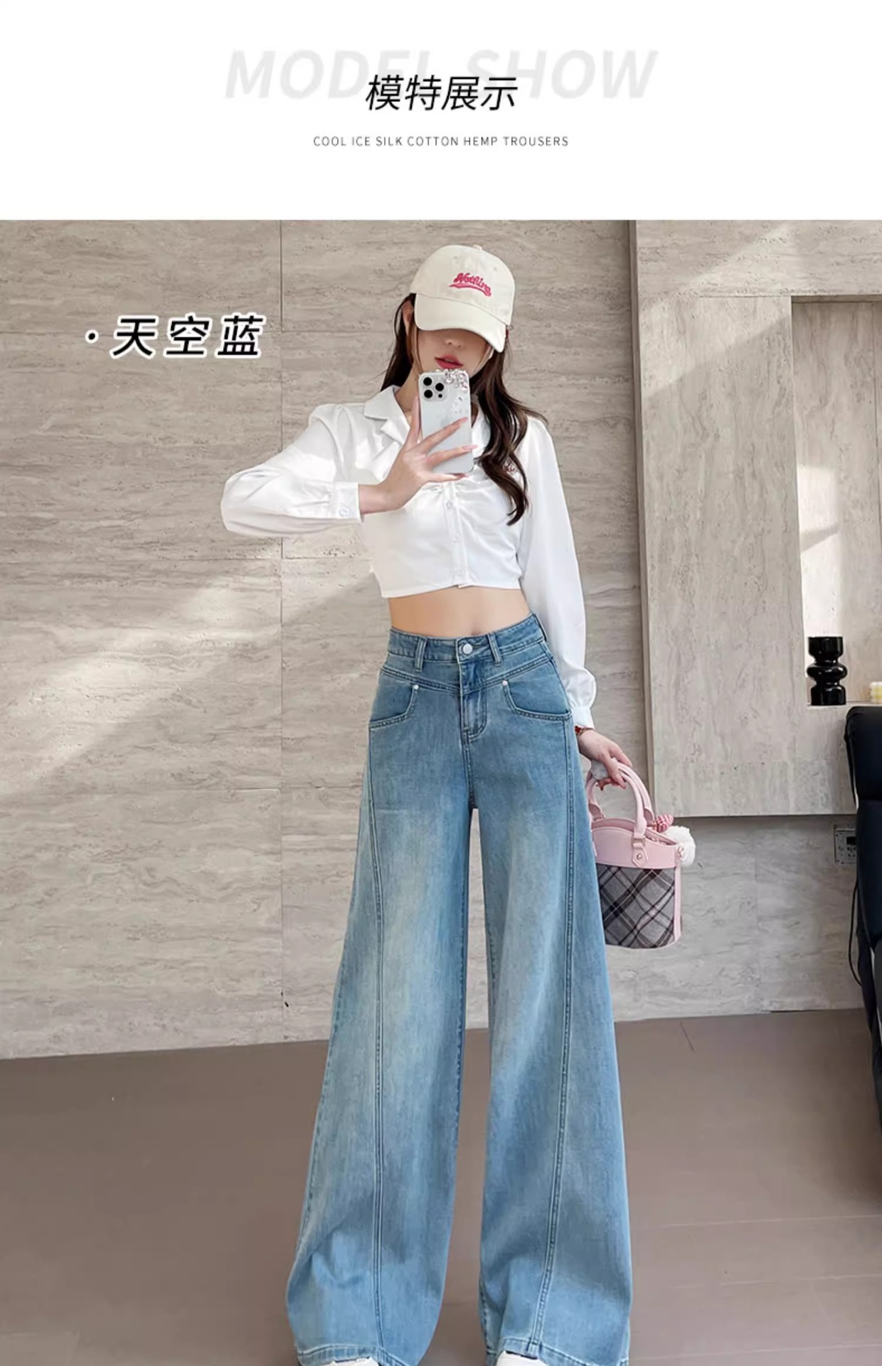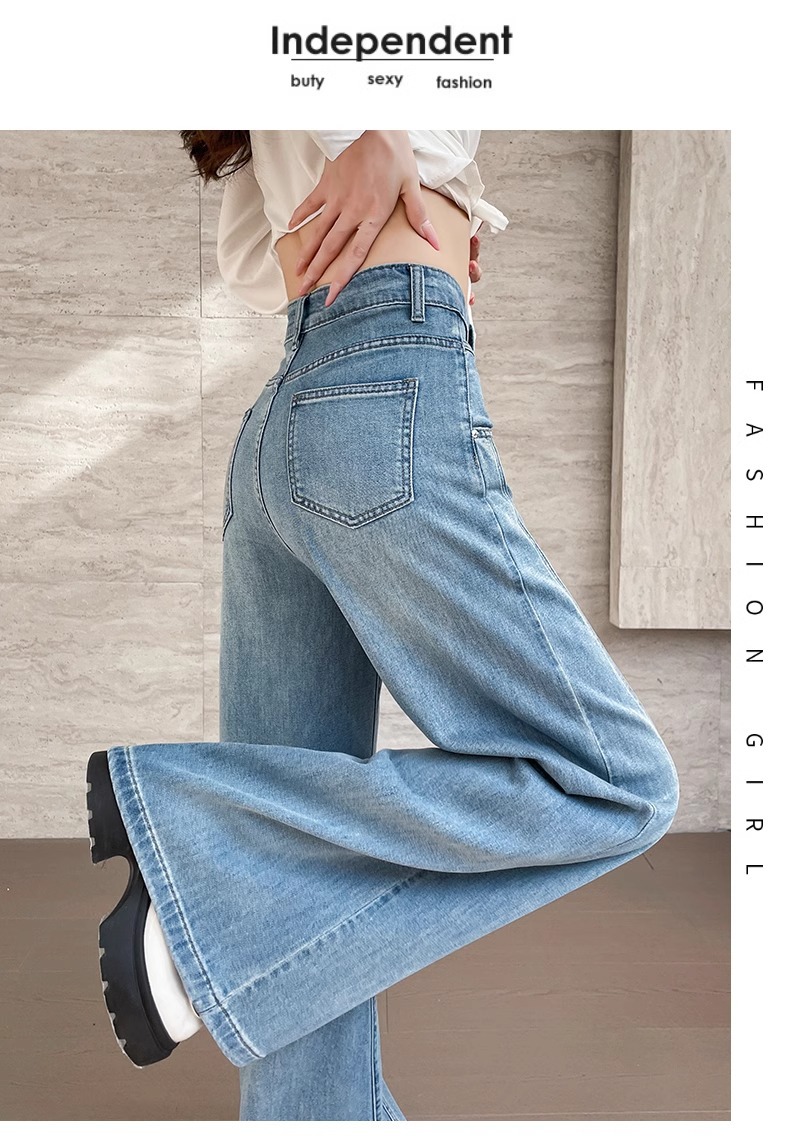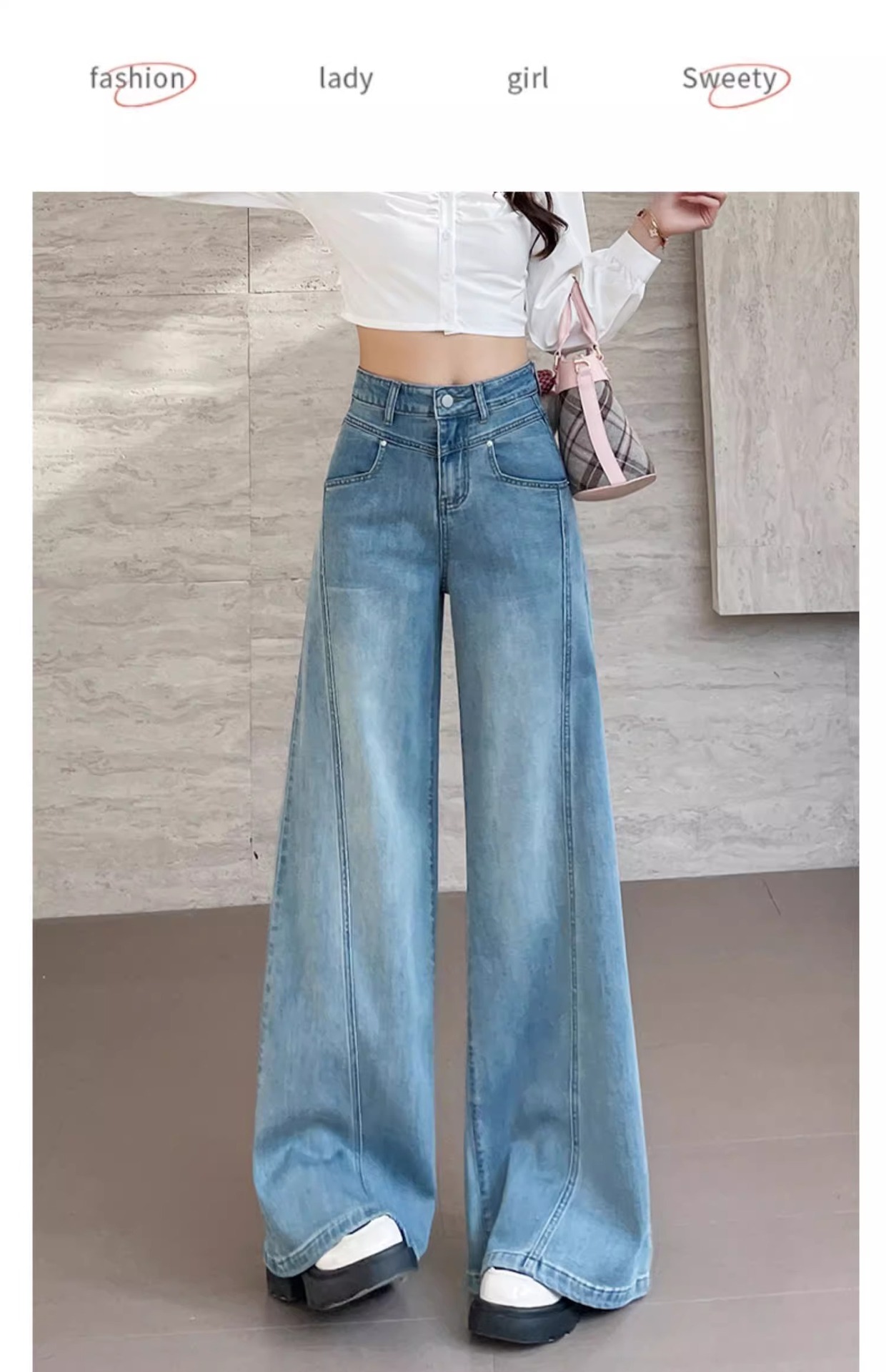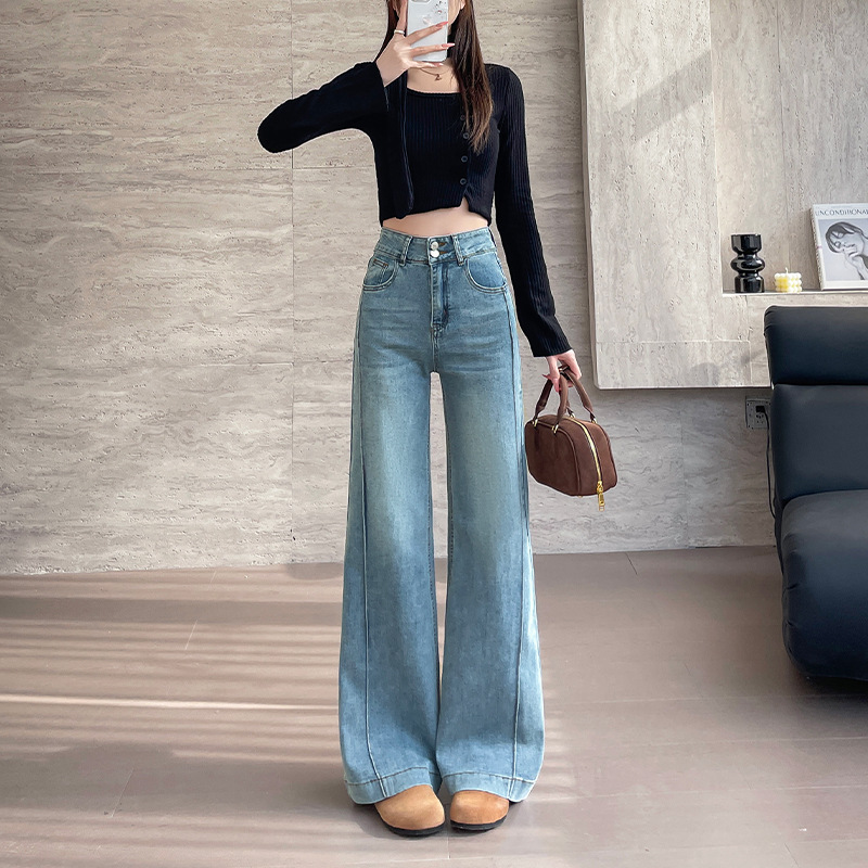 浅蓝色大阔腿牛仔裤女秋季2025新款侧边拼接遮胯小个子弹力喇叭裤
