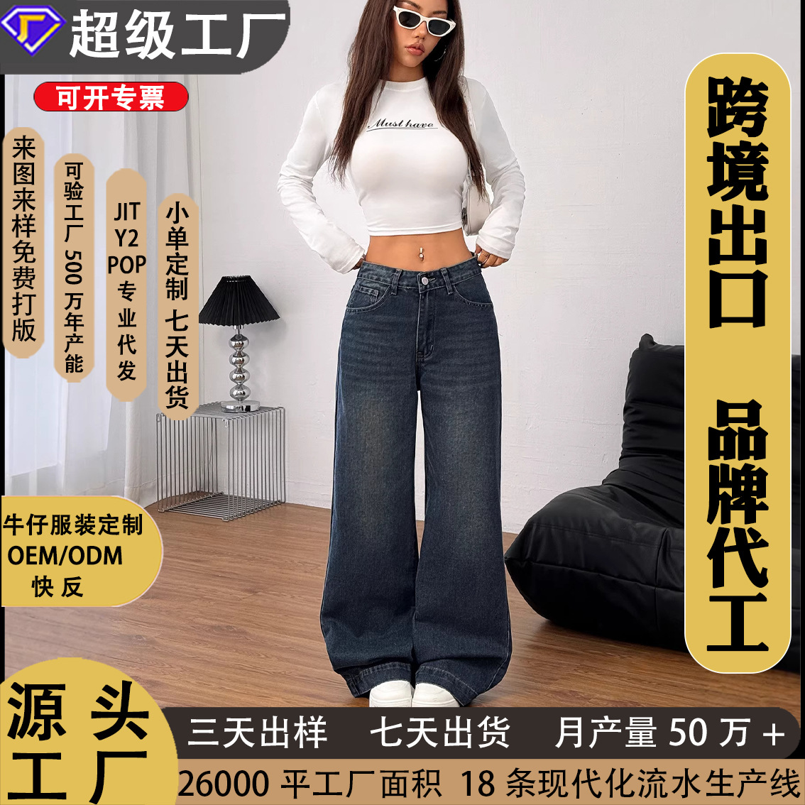 欧美跨境新款复古美式长款阔腿裤辣妹宽松牛仔裤女中腰直筒裤外贸