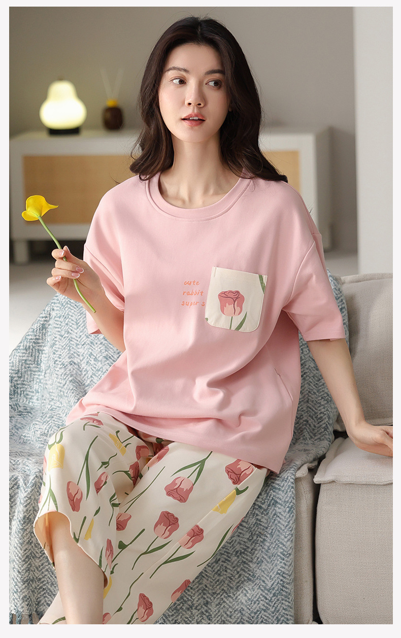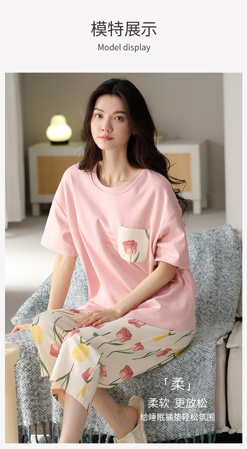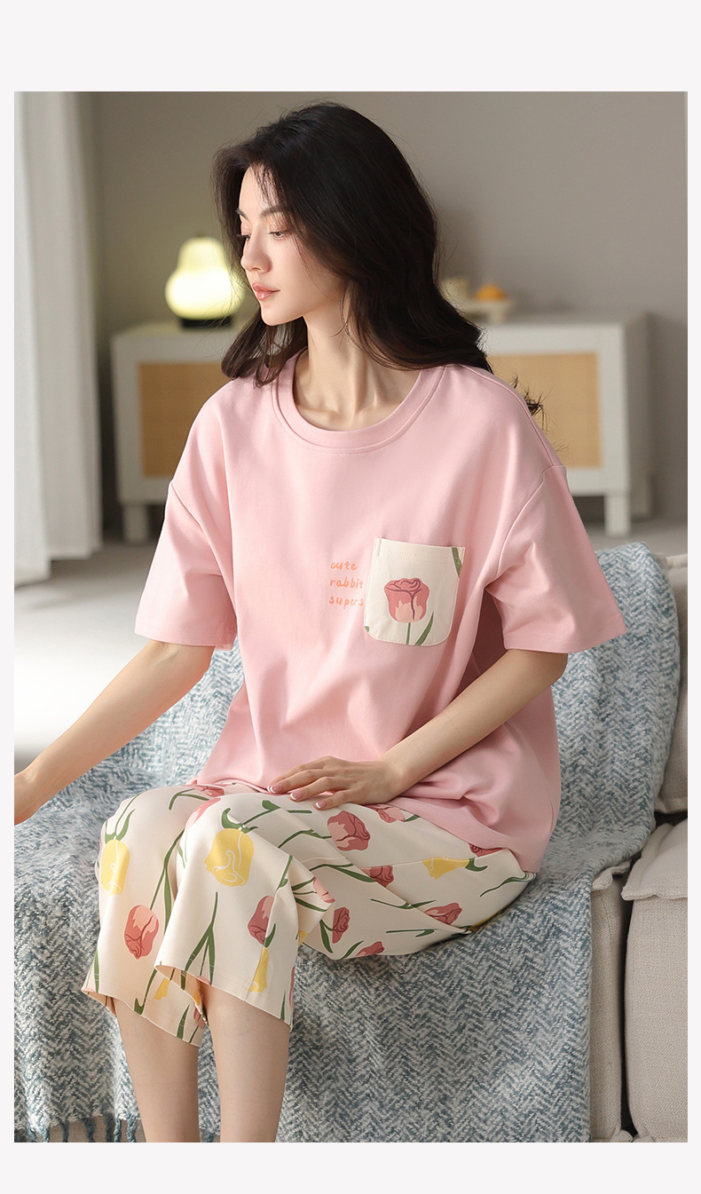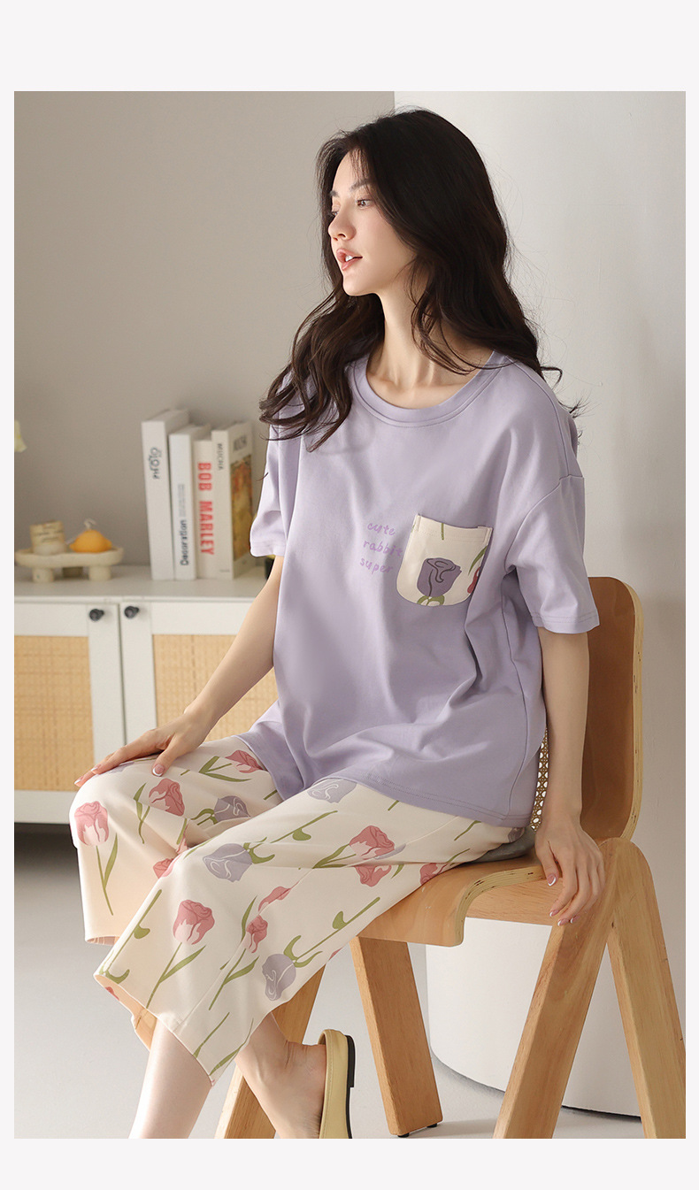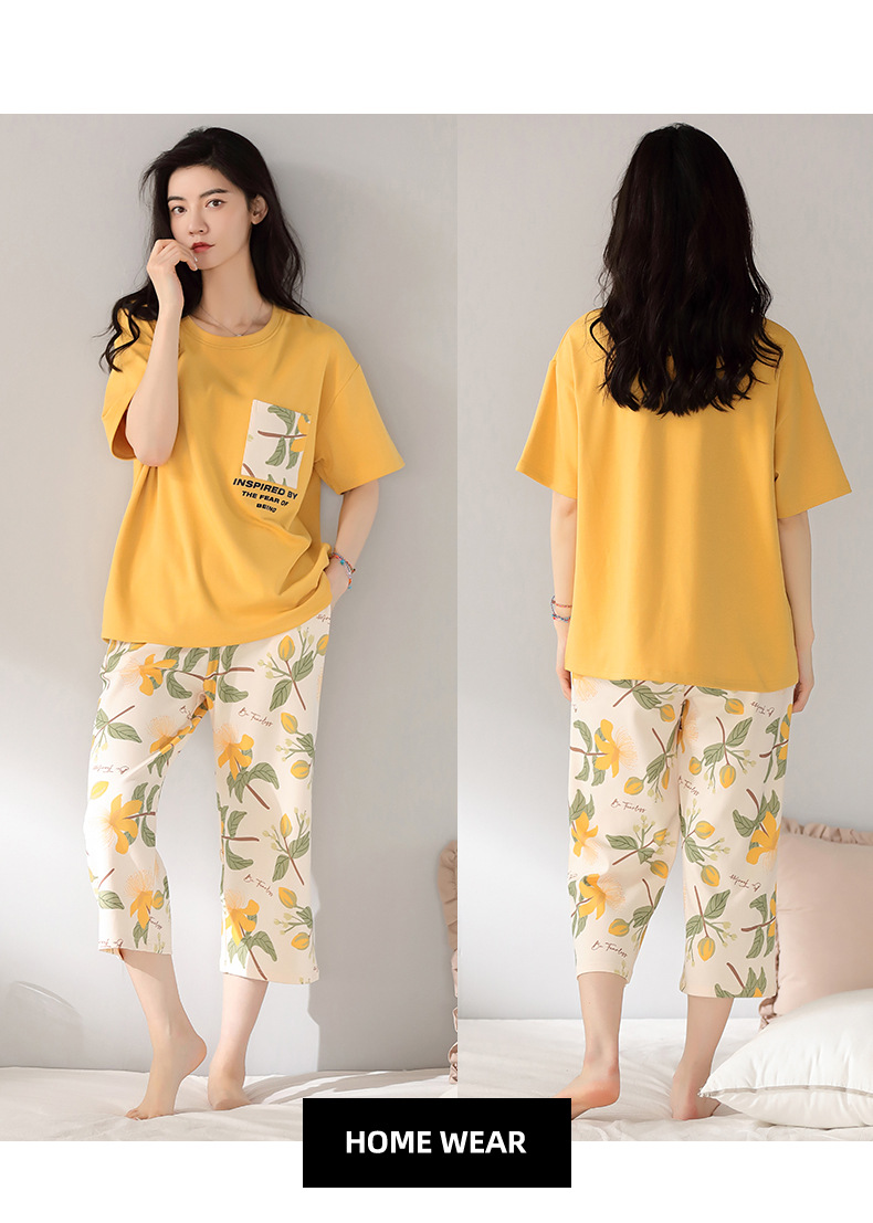 純綿パジャマ女性の夏の薄い半袖の7分のズボンの花のかわいいスーツは綿の女性の家の服を着ることができます。
