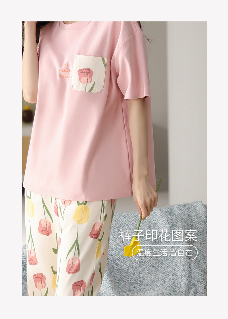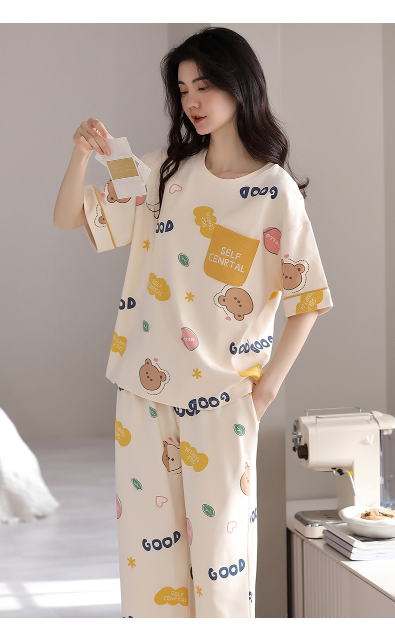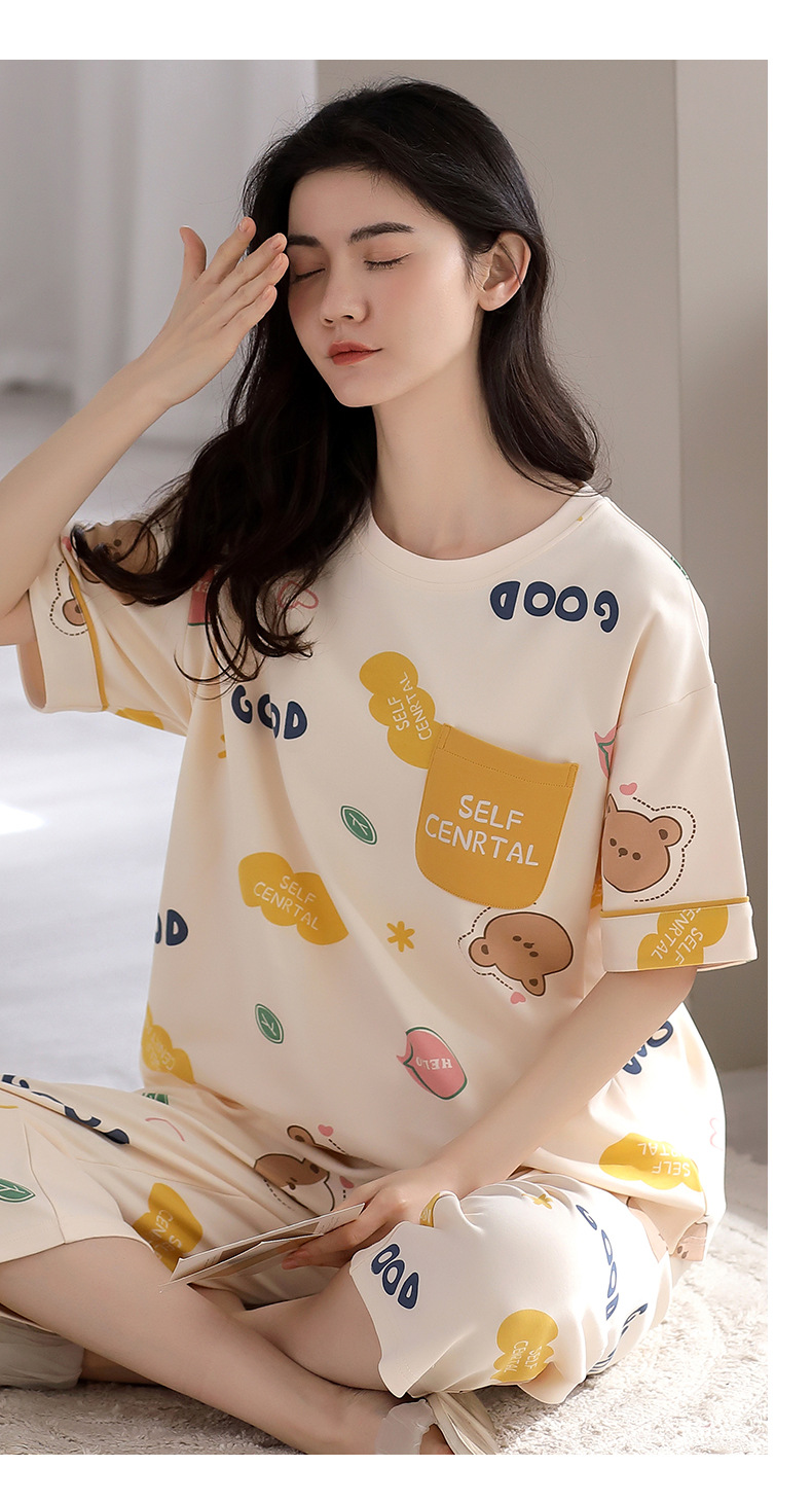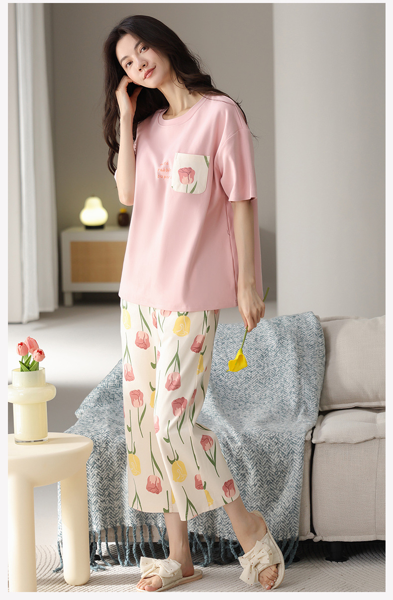 純綿パジャマ女性の夏の薄い半袖の7分のズボンの花のかわいいスーツは綿の女性の家の服を着ることができます。
