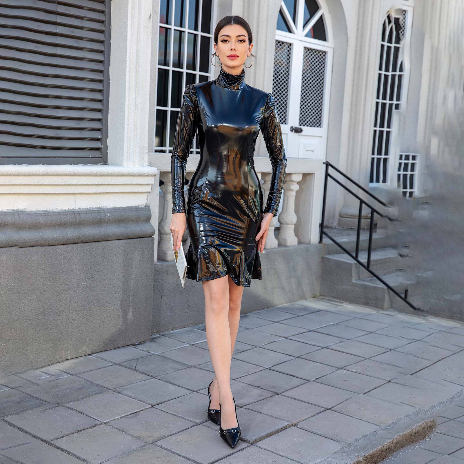 クロスボーダー貿易大きいサイズPUドレスヨーロッパとアメリカのAmazonレディースウィッシュ光沢のあるパテントレザークラブフィッシュテールスカート女性用