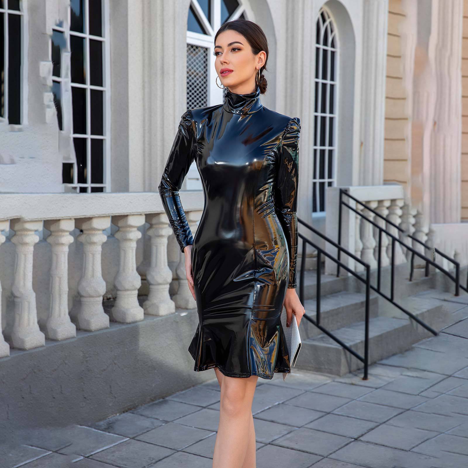 越境貿易PUワンピース 欧米アマゾン女性服 ウィッシュ ミラーレザー クラブ セクシー ヒップスカート 女性用