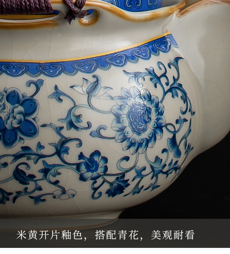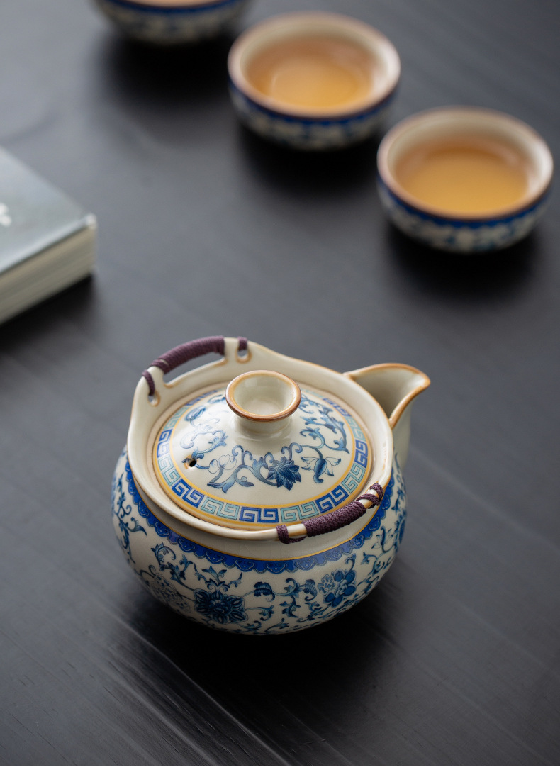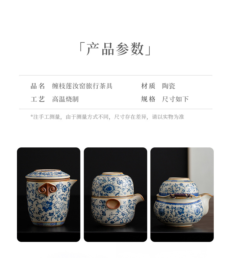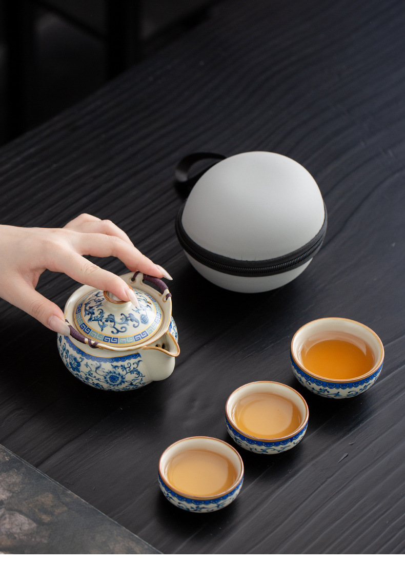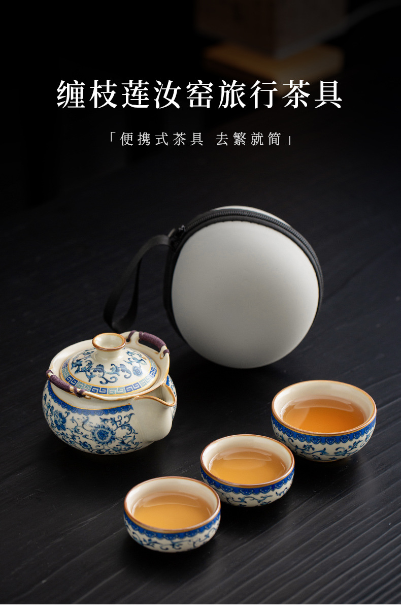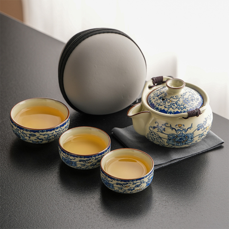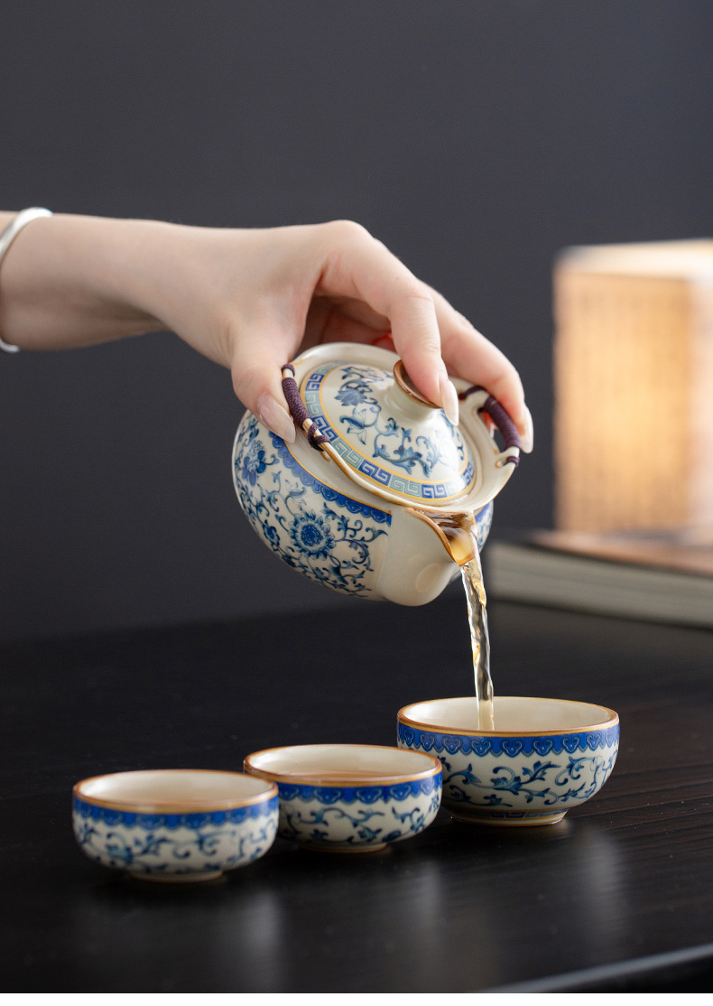 青花米黄汝窯旅行茶器セット一壺三杯屋外携帯用枝蓮陶磁器レトロなティーポット