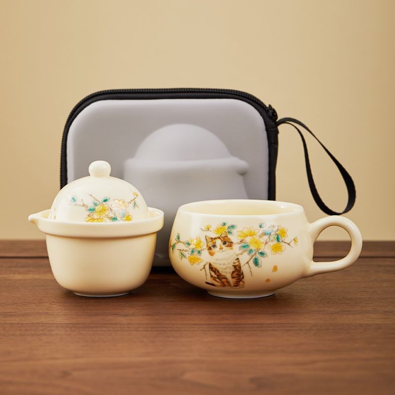 汝窯米黄旅行茶器セット一壺三杯携帯型青花陶磁器手掴み壺土産品卸売り