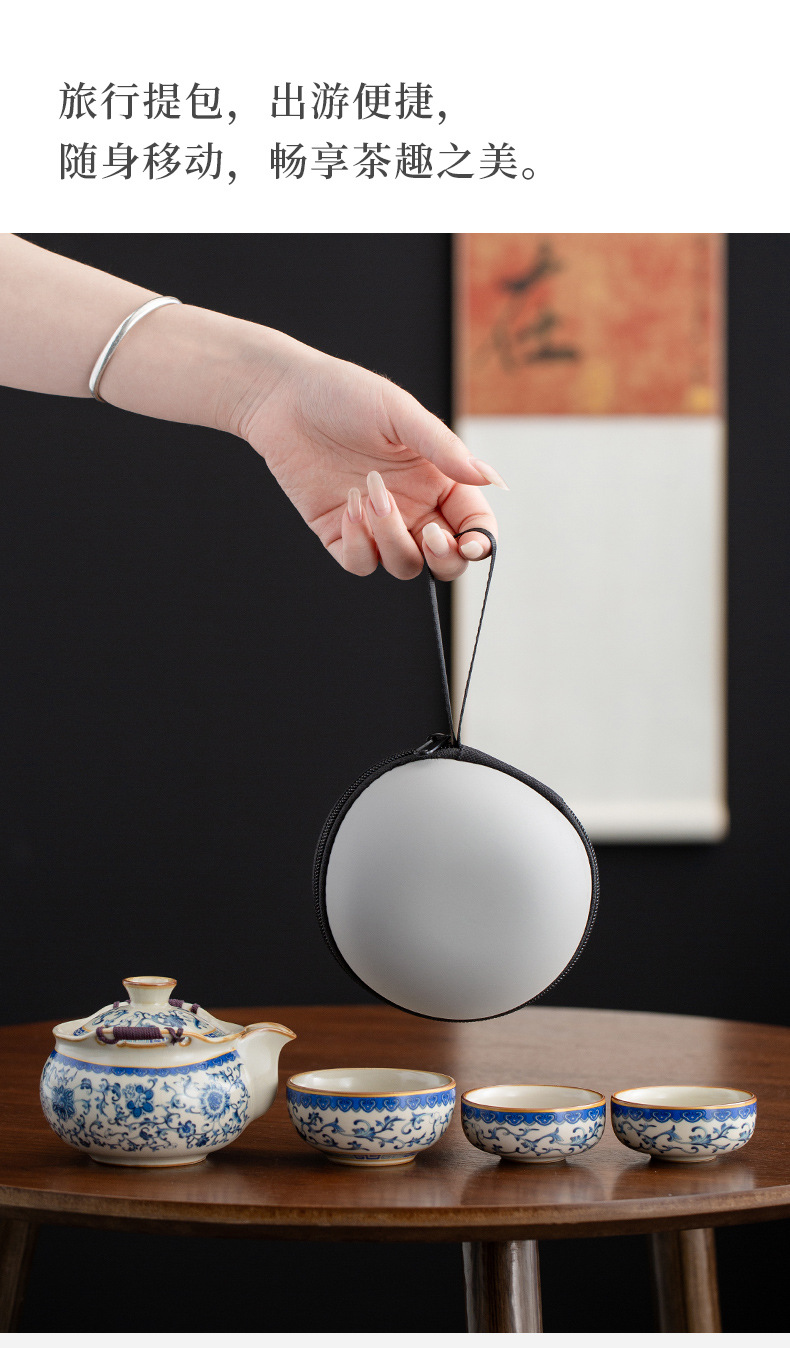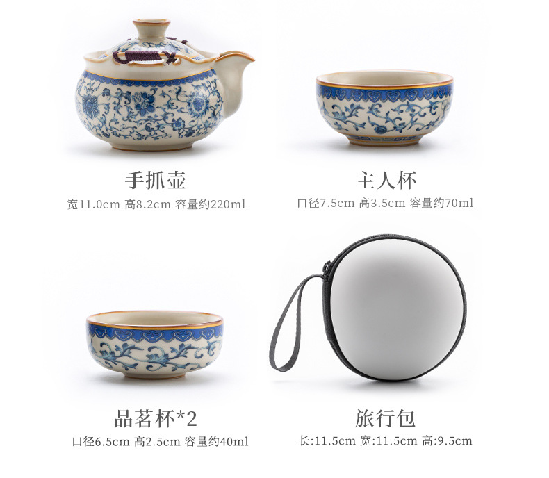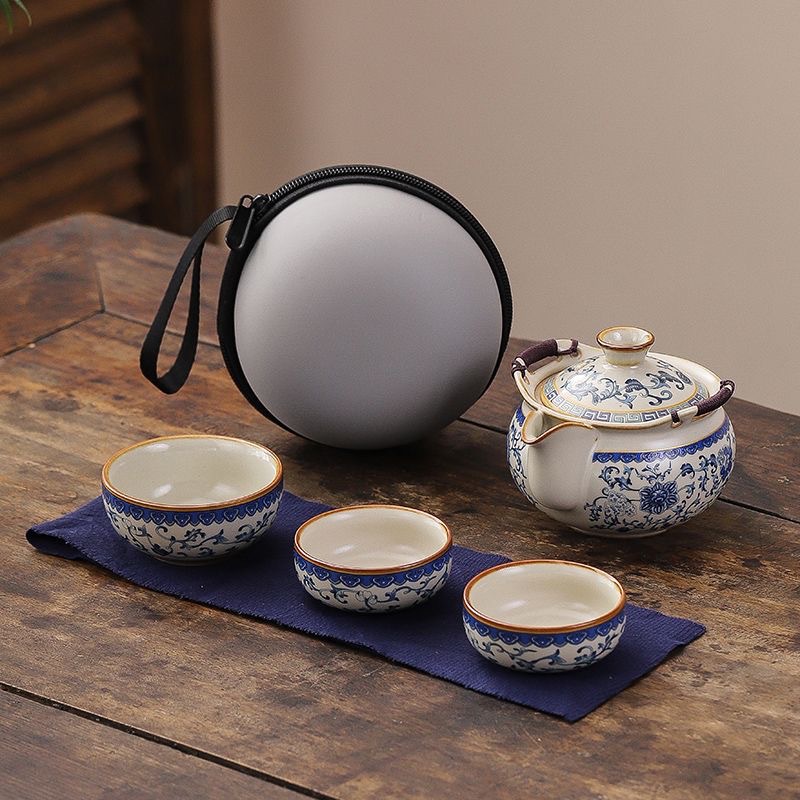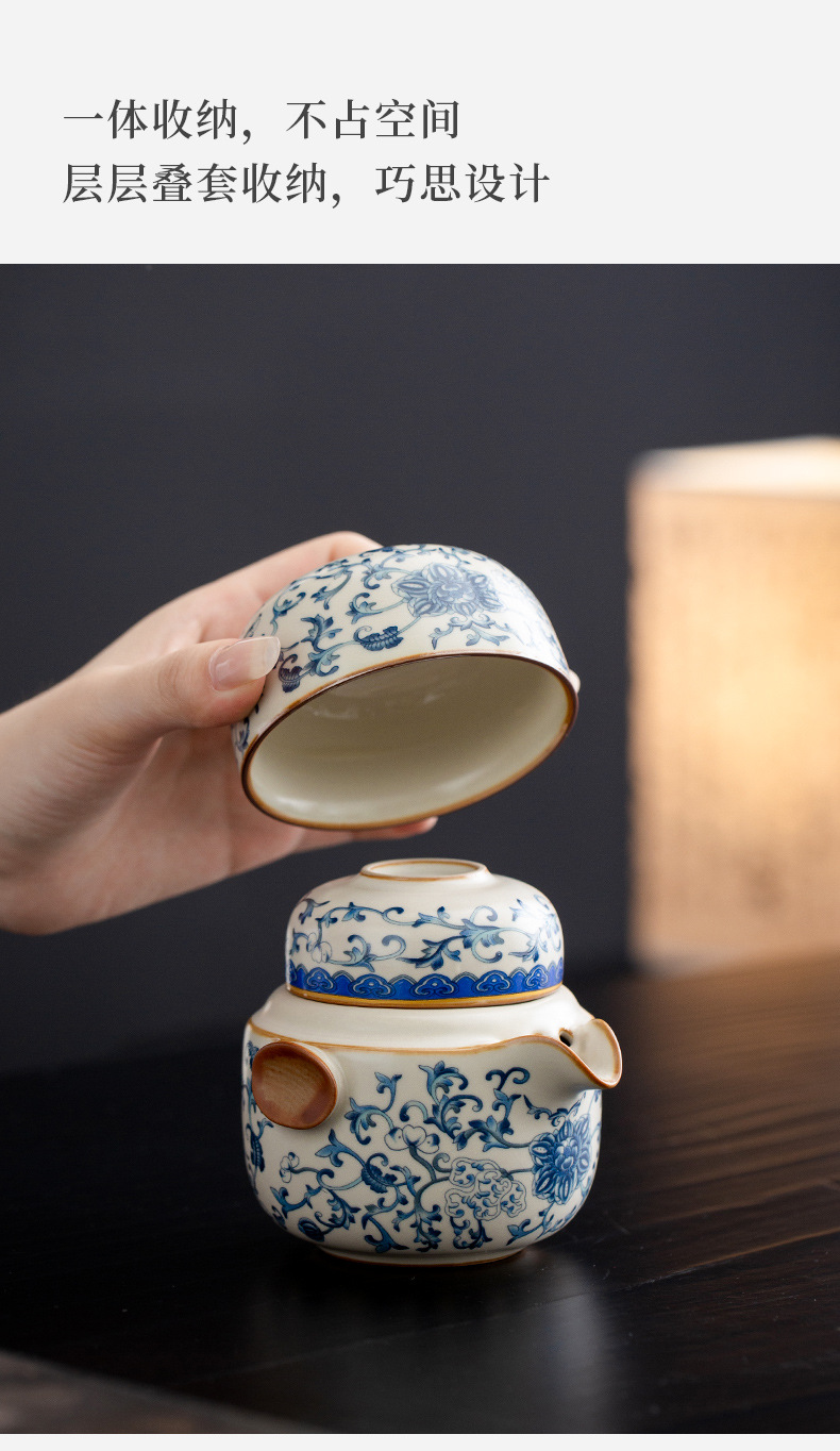 旅行茶器セット青花汝窯屋外キャンプ簡易金泡茶携帯型陶磁器快客一壺三杯