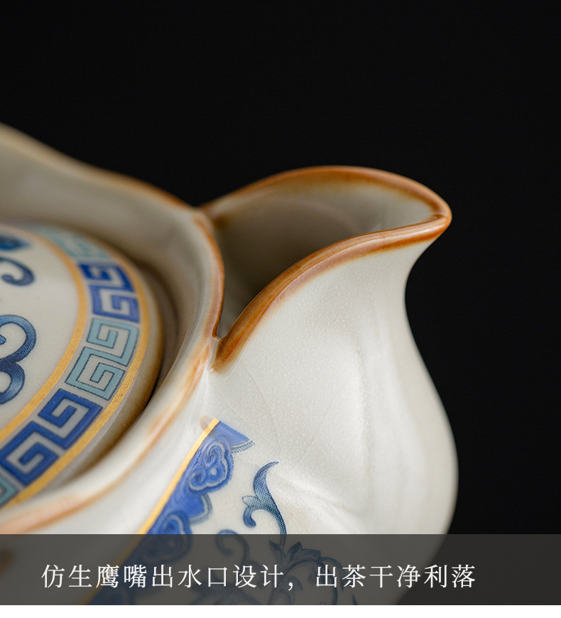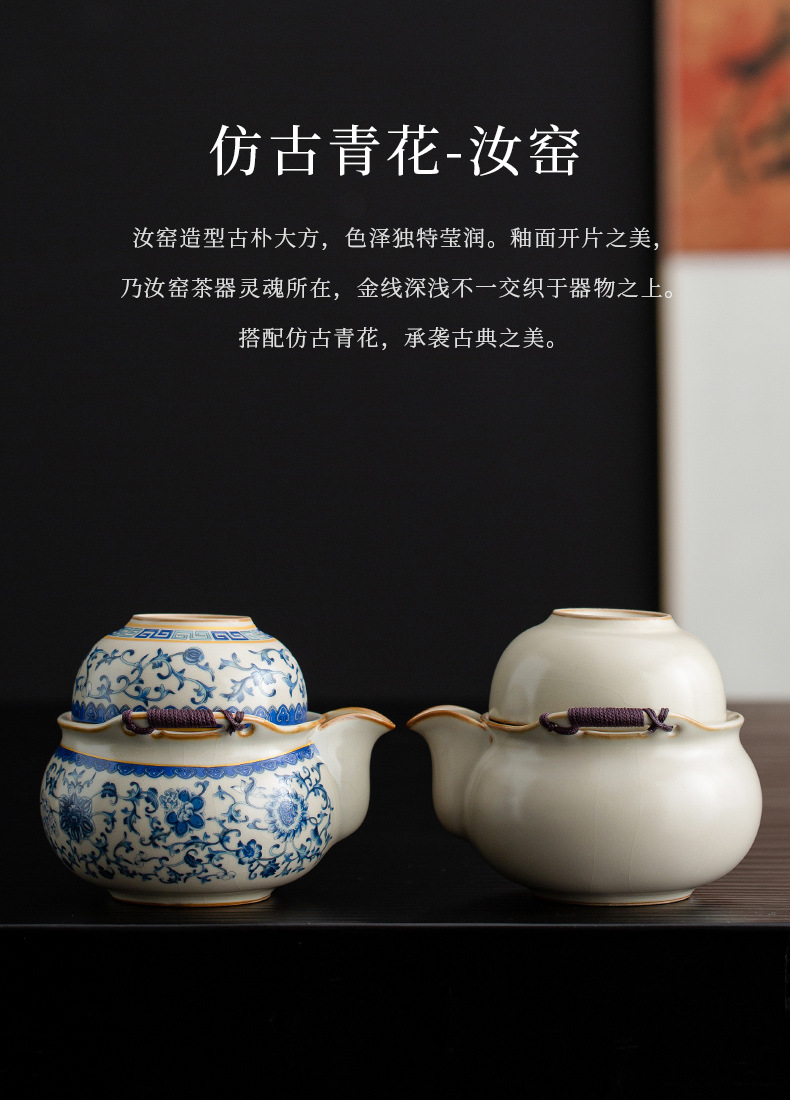 汝窑青花旅行便携式茶具小套装一壶三杯单人户外露营手抓壶快客杯