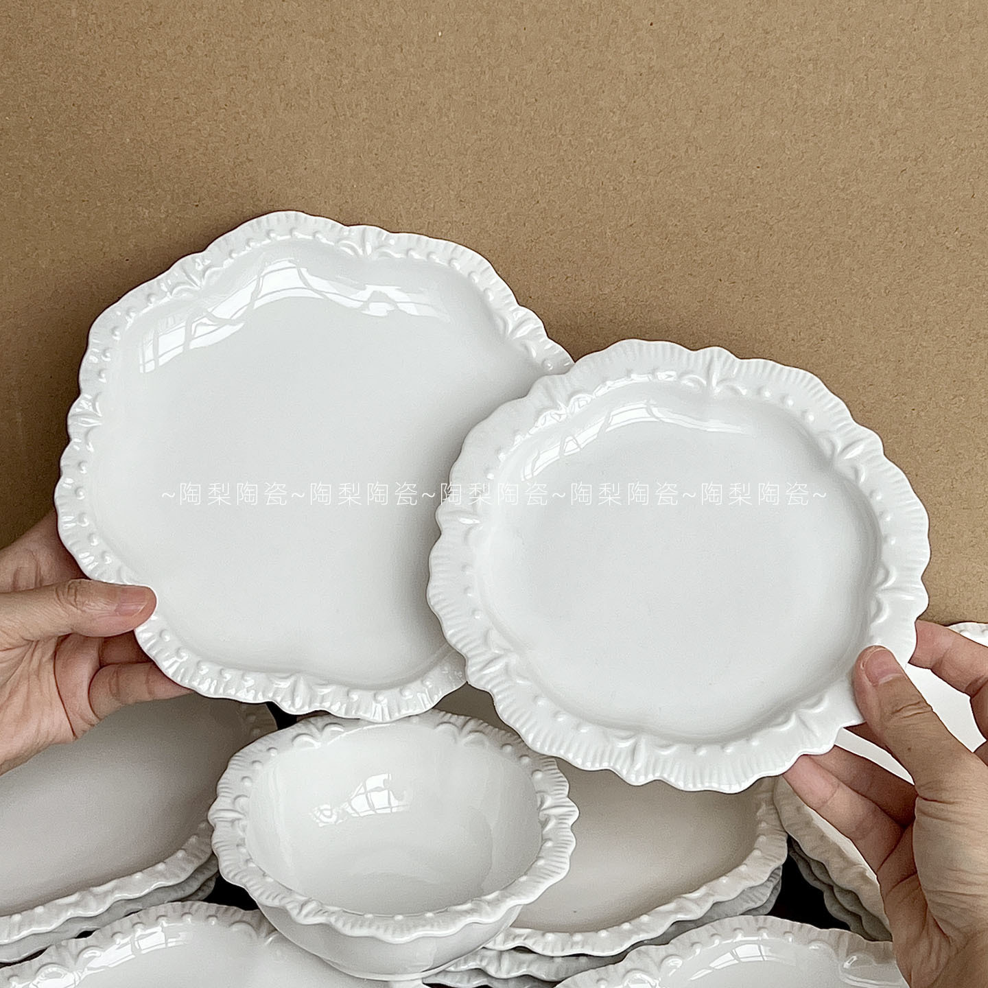 纯白花边盘子高级感轻奢家用西餐餐盘陶瓷早餐盘高颜值沙拉甜品盘