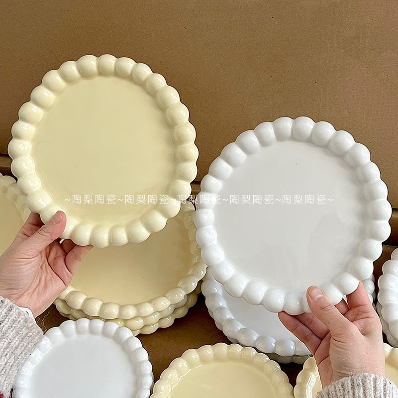 Ins風高颜値純白乳黄色珠点陶磁器皿フランス感不規則パスタ皿デザート皿朝食皿