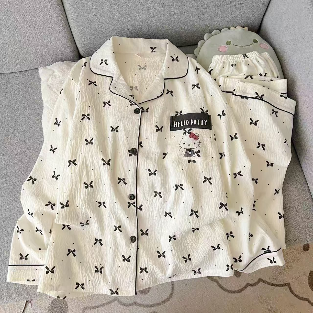 云朵棉三件套装夏季新款甜美可爱波点kt猫开衫翻领家居服女可外穿
