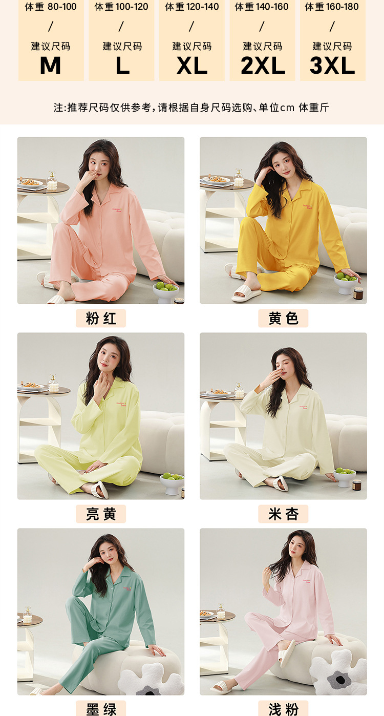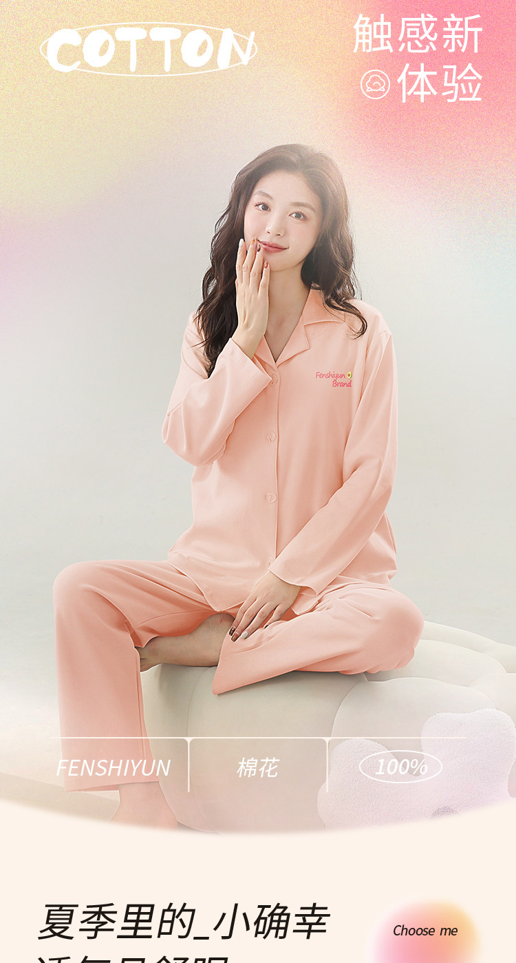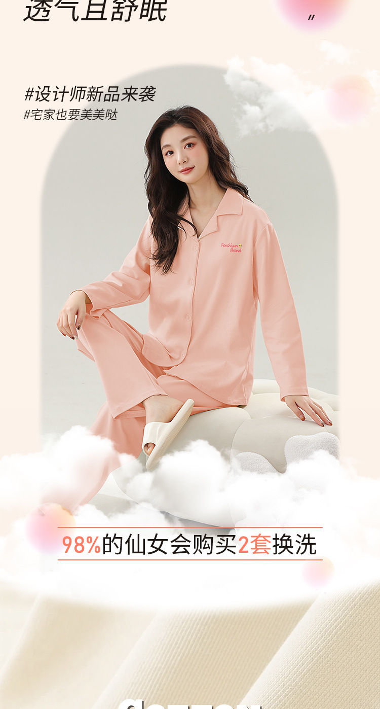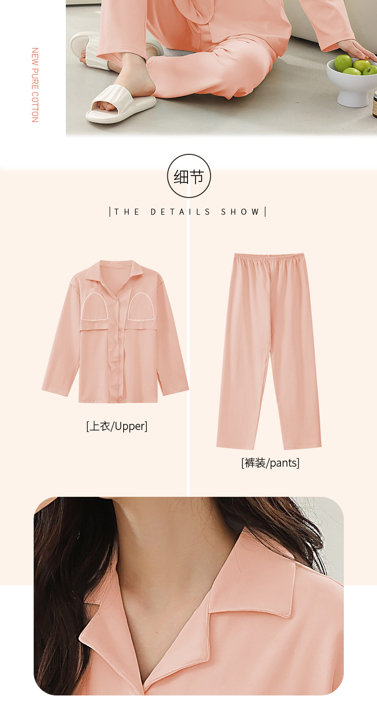 100% 純綿パジャマ女性は胸パッド丸首長袖ズボンを持っています。