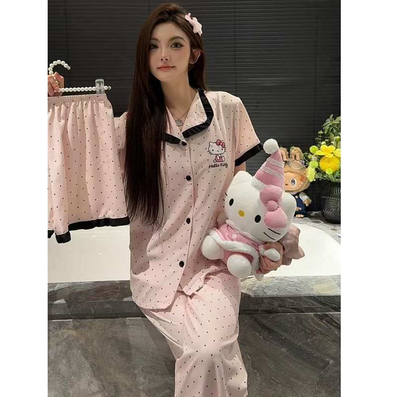 冰雪丝三件套装夏季新款甜美可爱波点kt猫开衫翻领家居服女可外穿